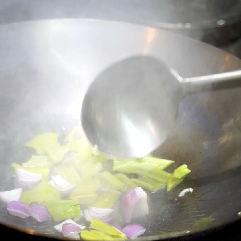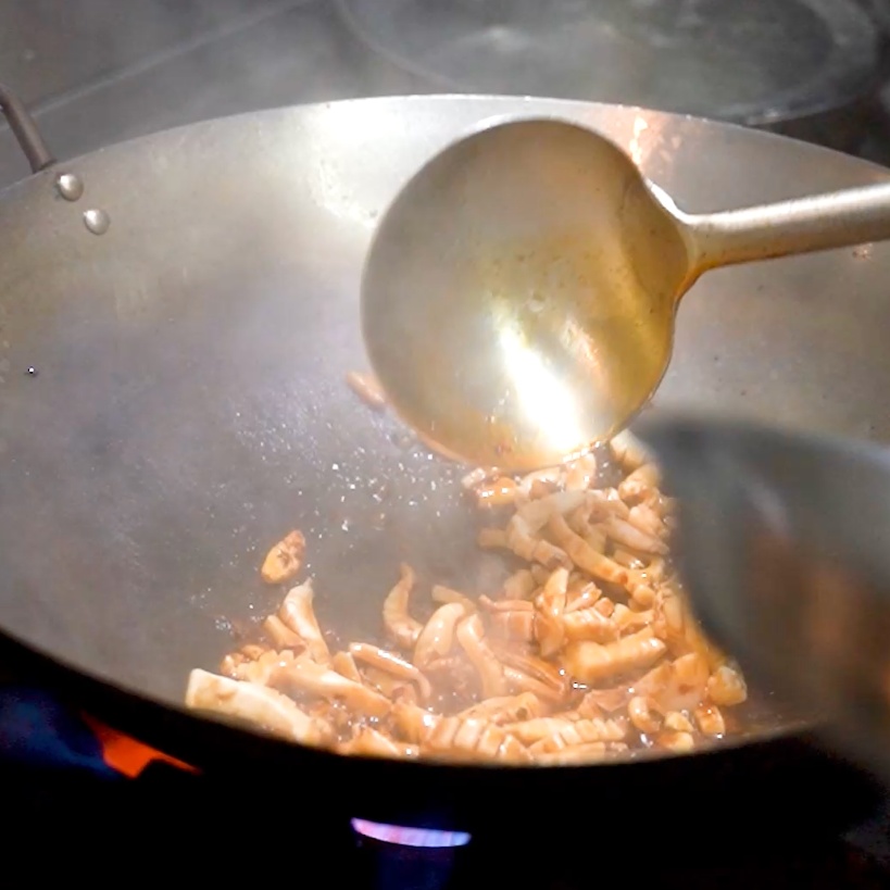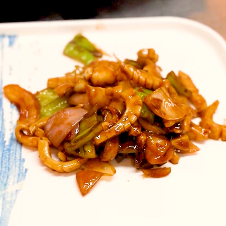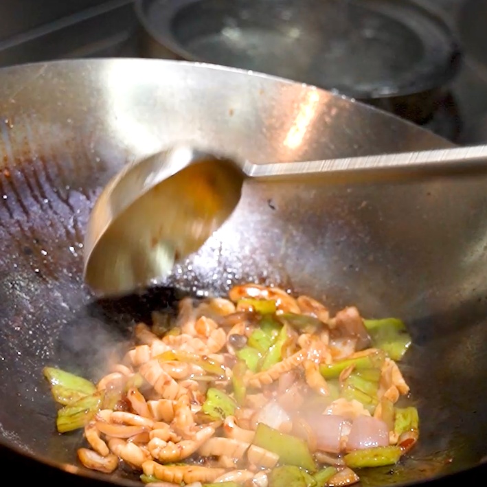 8. 墨鱼条下锅快速翻炒,让酱汁均匀包裹在墨鱼条上,再加入洋葱和青椒一起翻炒;