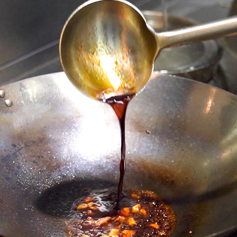 7. 大蒜头拍碎,加豆瓣酱、甜面酱爆出香味,加黄酒、老抽、生抽炝香,放一勺糖,不用加水;
