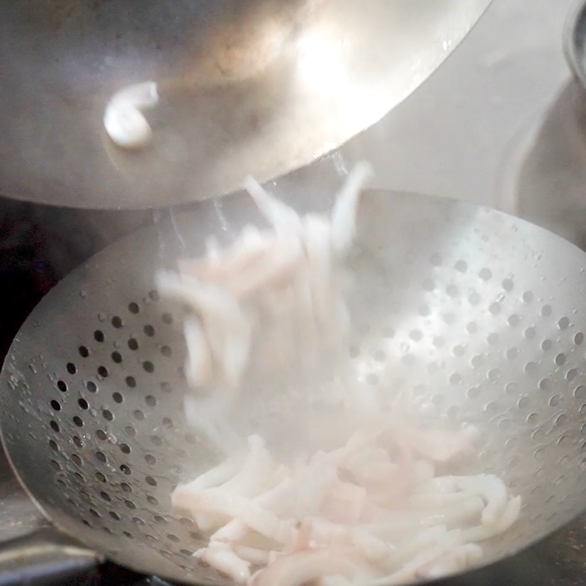 5. 烧一锅开水、加点黄酒,将墨鱼烫一下,让墨鱼肉卷起来,也去掉点腥气,断生后捞出沥干;
