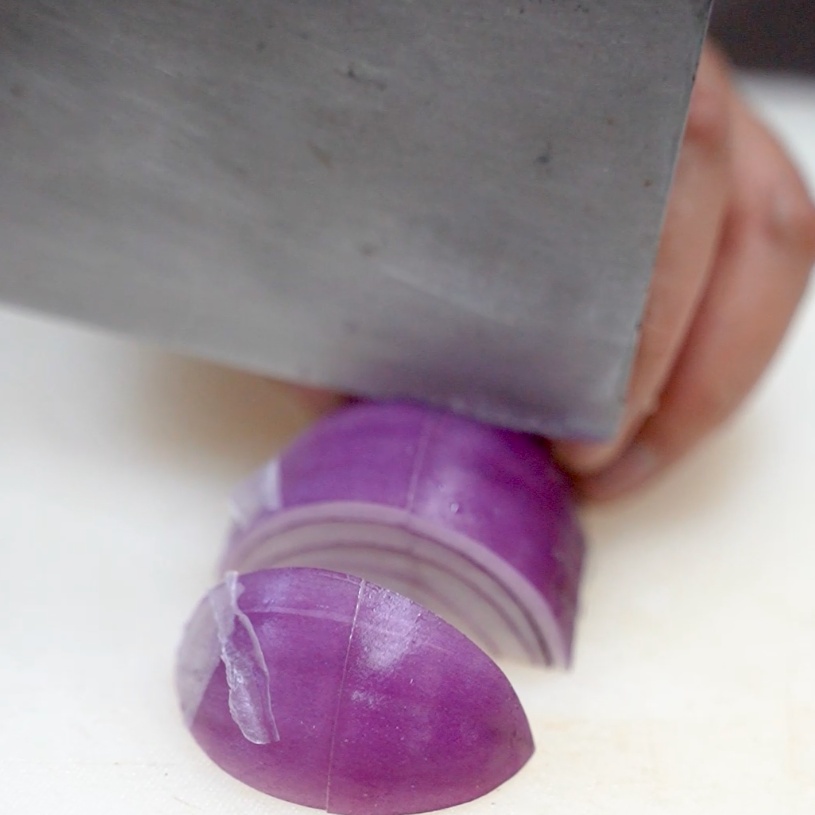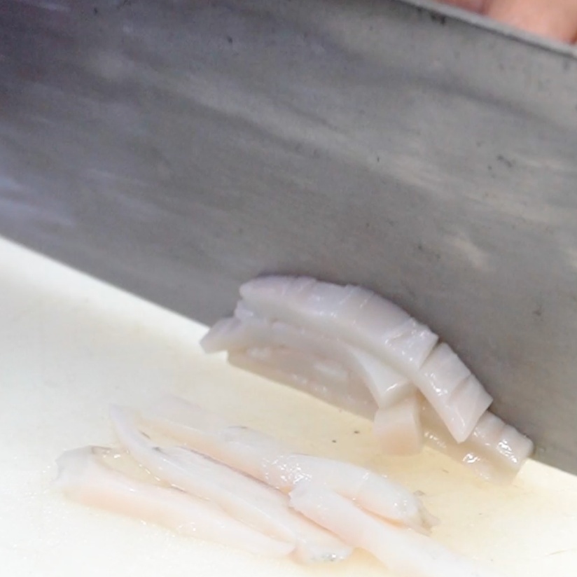 3. 在墨鱼肉上切花刀,不切断,再切成墨鱼条;
