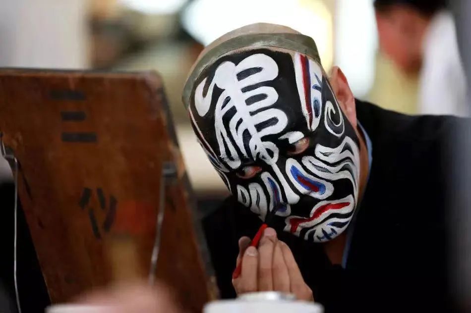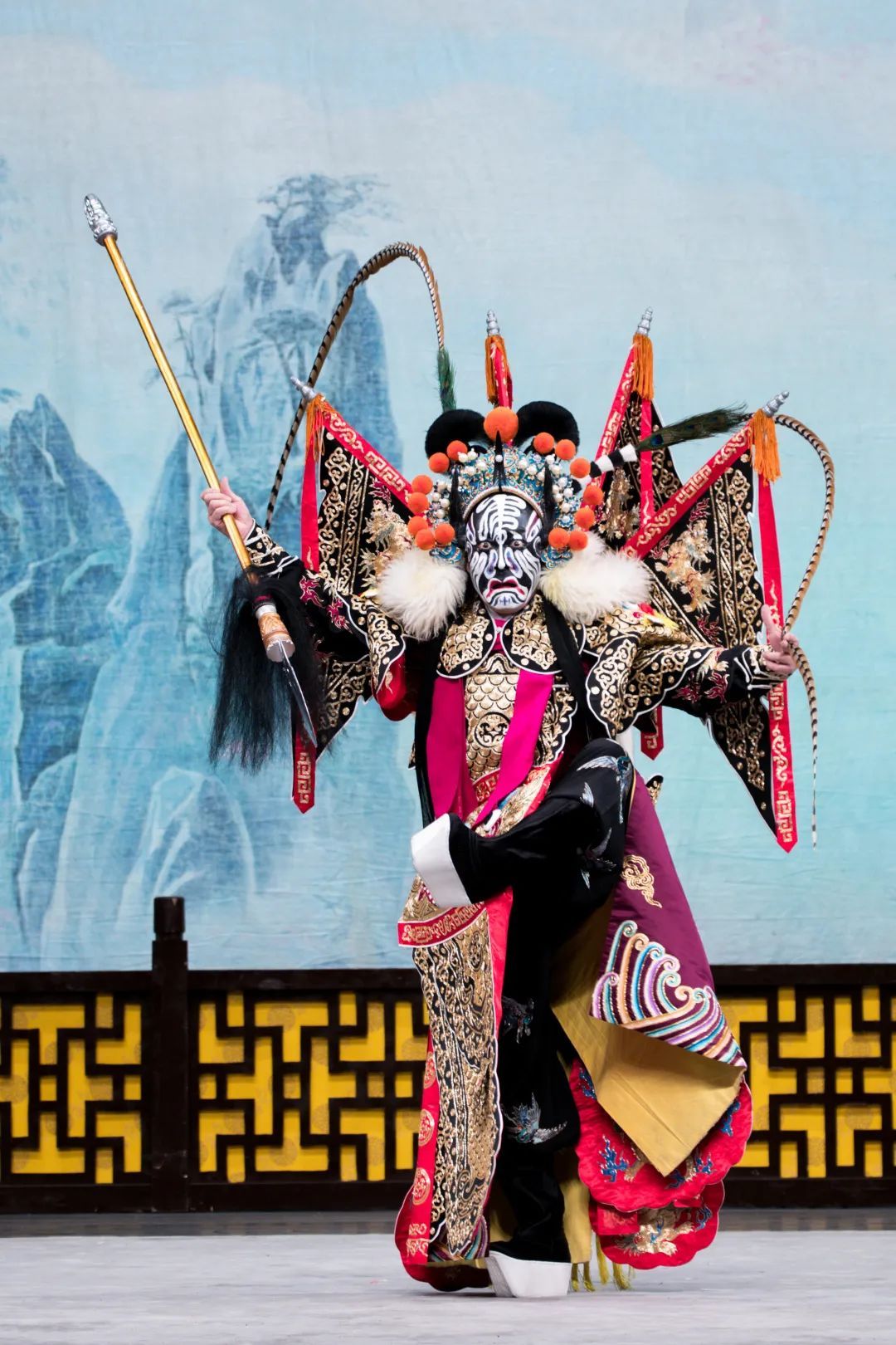 上海京剧院剧照《七郎八虎闯幽州》,奚中路饰杨延嗣,这戏中的“七郎”的脸谱颇具特色,额头中间用一笔勾画而成的“虎”字称为“一笔虎”,表示人物勇猛、威武的性格特征,加上头上戴翎戴尾的装饰,使人物形象更加丰满,如有饿虎扑食之势,给观众强烈的视觉冲击。