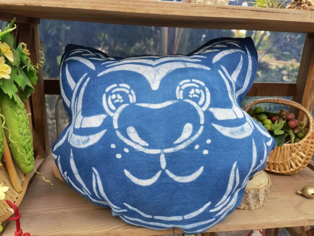 药斑布是传统蓝染布艺的一种,旧称灰缬,俗称浇花布、药斑布,也称蓝印花布,它有着近千年的历史,纹样丰富、寓意美好,是古代劳动人民智慧的结晶。在虎年来临之际作品虎虎生威抱枕,就是运用传统药斑布的工艺染制出一只可爱的老虎头抱枕。