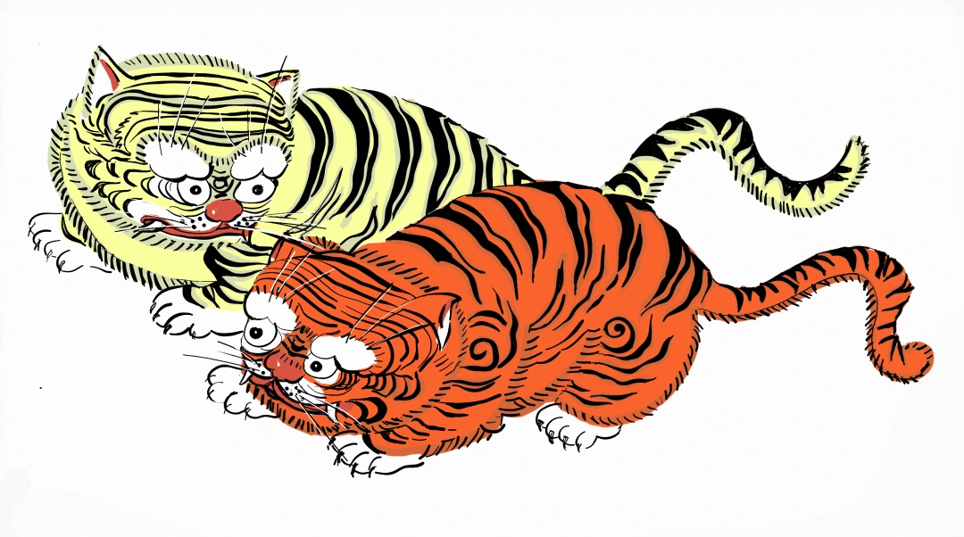 《艾虎》是由艾叶和菖蒲装饰的一只充满民间审美趣味的辟邪虎,以昂首挺胸,摇头甩尾的姿态迎接即将来到的壬寅新年。《上山虎》是以牡丹、钱币、蝙蝠装饰的一头回首呼啸的老虎,精神饱满昂首阔步,仿佛在巡视山林。