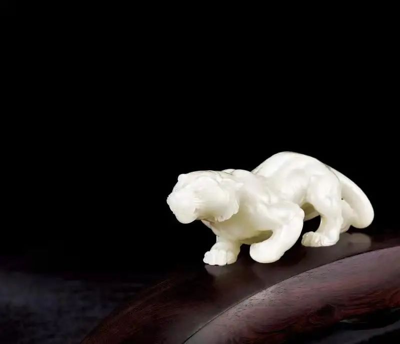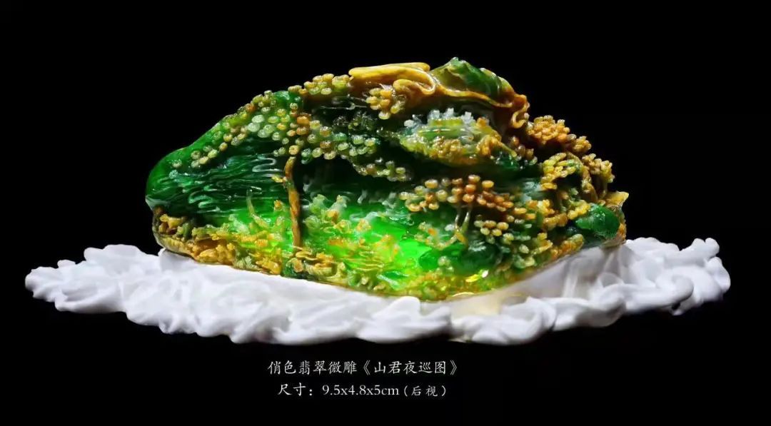 海派玉雕是以上海为中心地区的玉石雕刻艺术风格的派系。古时以虎为山兽之长,《山君夜巡图》是一块9.5×4.8×5cm的黄加绿翡翠,形体如山,山间12棵古松耸立,130多只老虎,各呈棕、黄和白色,姿态不一,最小的老虎脸部仅1mm宽。《蓄势》是一只猛虎,嘶吼着匍匐前行,静静地将力量蓄存在虎爪,仿佛正在积聚全身神勇,随时准备纵身扑跃。