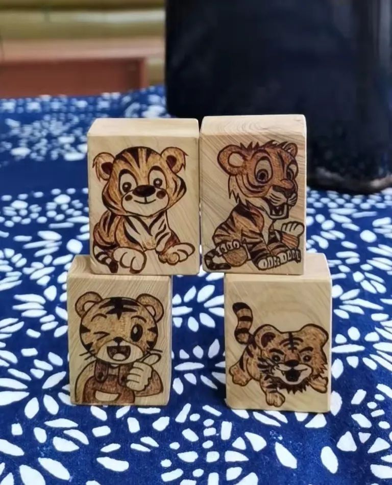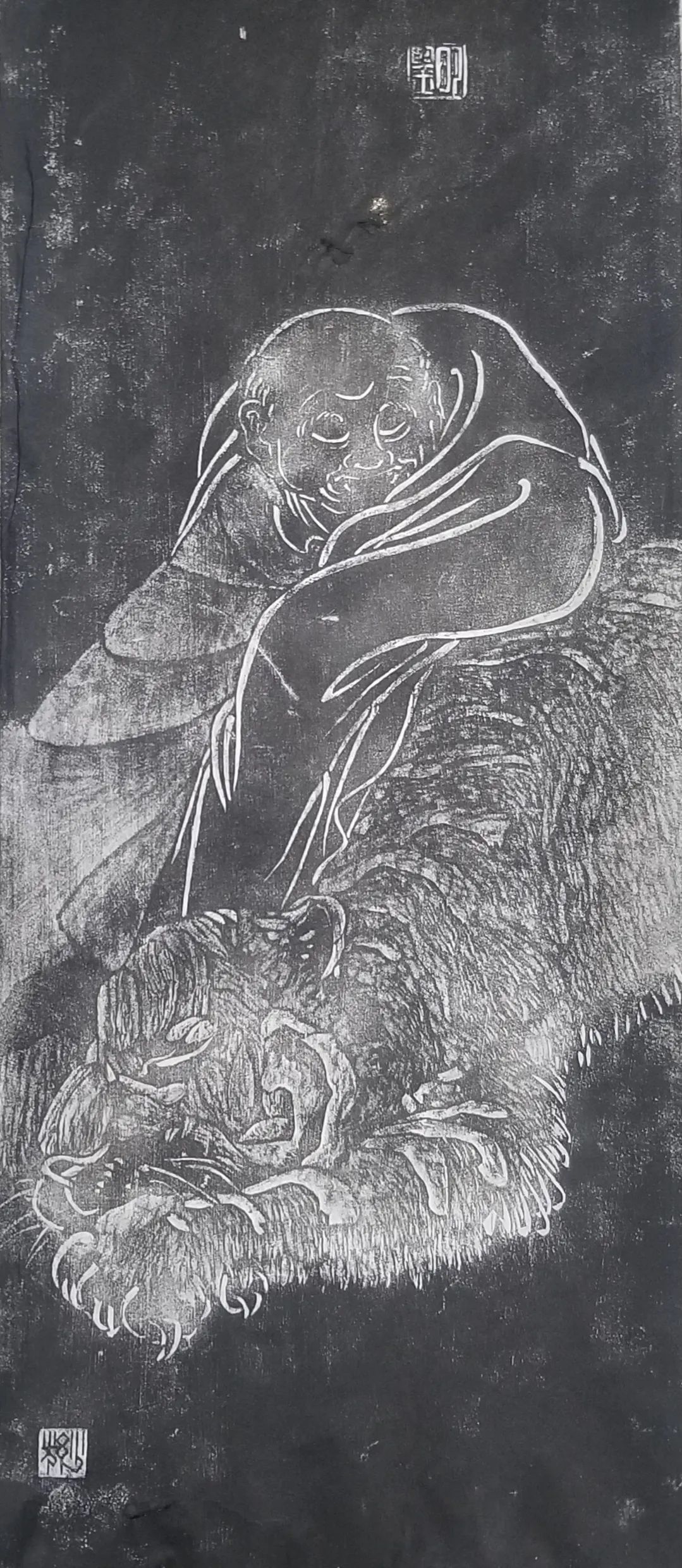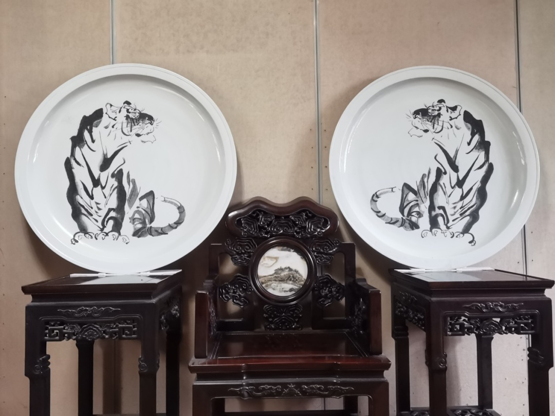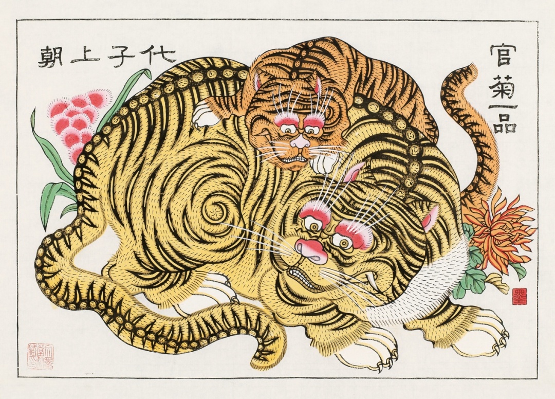福虎图画面中题有“官菊一品”“代子上朝”。老虎乃“兽中之王”,指代“一品大员”。画中主角为一父一子的老虎造型,也有“望子成龙”之意。该画通过传统木刻雕版所进行手工套版印制而成,其中花卉与老虎的开脸部分辅以手工敷色。虎与“福”“富”谐音,寓意福运临门、富贵盈门。双福图中两只憨态可掬的小老虎,意为“双福”。