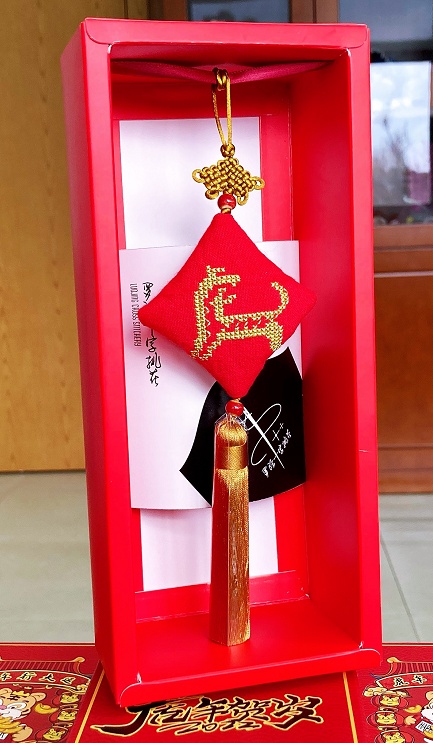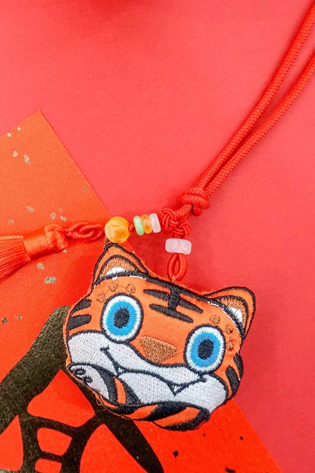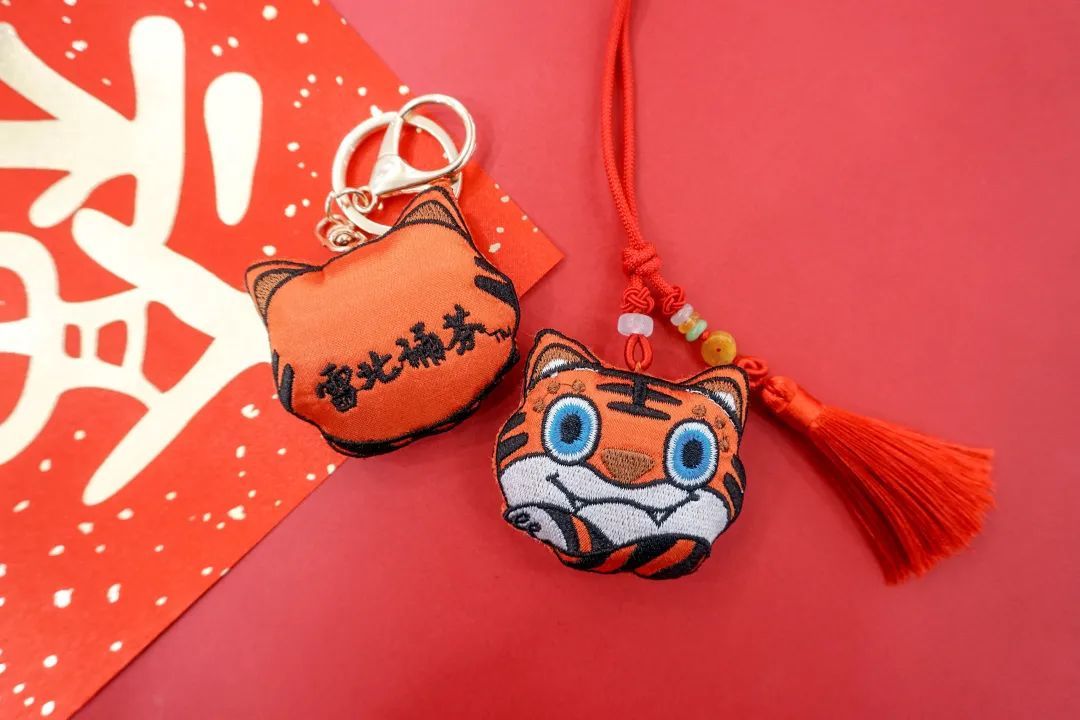 香囊主体运用了宝山区市级非遗项目罗泾十字挑花技艺制作而成,一面以虎字象形文字构成。虎象征勇敢、无畏。另一面由十字挑花传统独立纹样组合而成,寓意着四方汇财。中国结中的流苏也叫穗子,寓意衣食无忧。