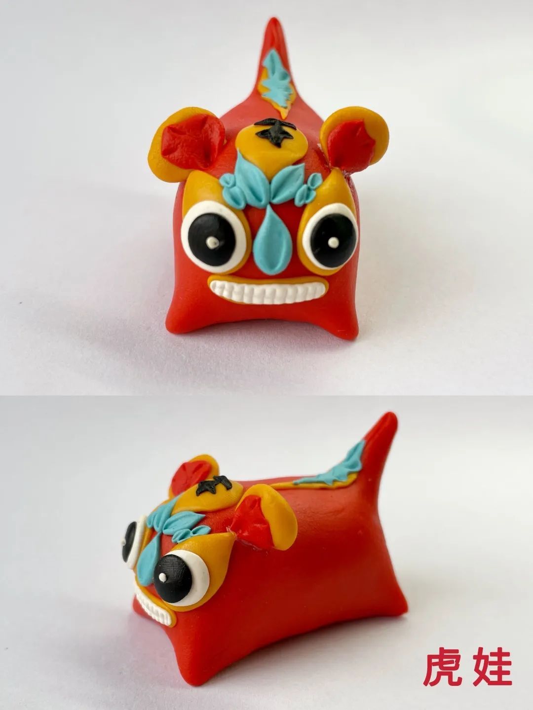 具有海派风格的上海面塑自清末创立,至今已有百余年历史。人物众多、场面宏大,形象逼真、具有雕塑效果,是海派面塑的四大审美特点。作品《虎娃》参考了民间虎头鞋的样式,颜色鲜艳对比强烈,造型一气呵成。