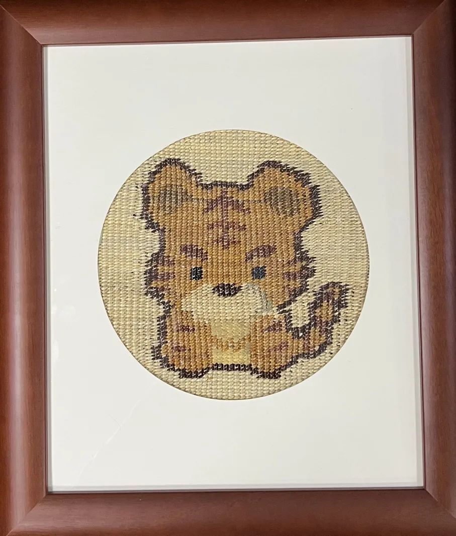 徐行草编已有1000余年历史,徐行黄草色泽淡雅,质地光滑坚韧,并能染色,用它编出的工艺品纹理清晰,细密匀称,松紧有度,平整光洁,成为一方名产。作品《草编卡通虎》以素色黄草为底,搭配了棕、褐、红三色黄草,经纬之间需不断交互编织,最终勾勒出一只憨厚的草编小老虎形象。