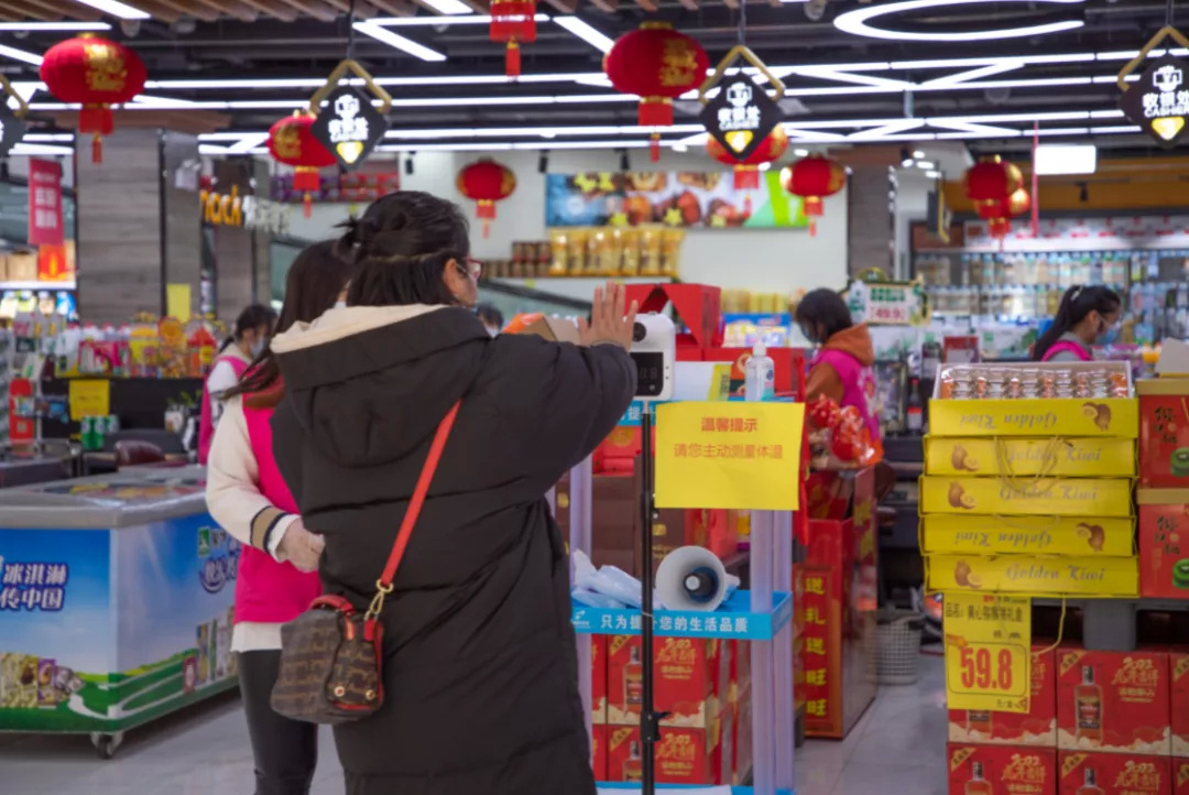 在金山区海盛路的一家大型商超内,红灯笼高挂,各类年货摆放在显眼位置,节日氛围十分浓厚。在入口处,记者看到有专人正在给市民测温、查看健康码,并提醒大家进出超市佩戴好口罩。