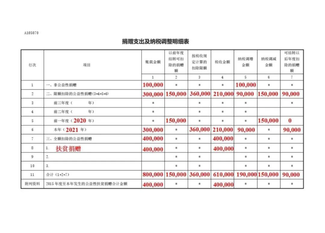 4.通过市民政局向目标脱贫地区捐赠的40万元,在2021年汇算清缴时可以全额扣除,填入A105070《捐赠支出及纳税调整明细表》第8行内。最后汇总填列第7行。