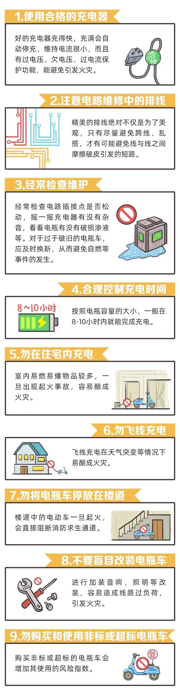 电动车基本上都是白天使用、晚上充电,充电时间大概6至8小时,电池充满时往往是在夜间或凌晨。而夜间由于大家都处于睡眠状态不能及时断电,电动车容易达到过度充电,造成充电器、电瓶发热引发火灾。据分析统计,绝大多数的电动车火灾事故发生在夜间或凌晨。