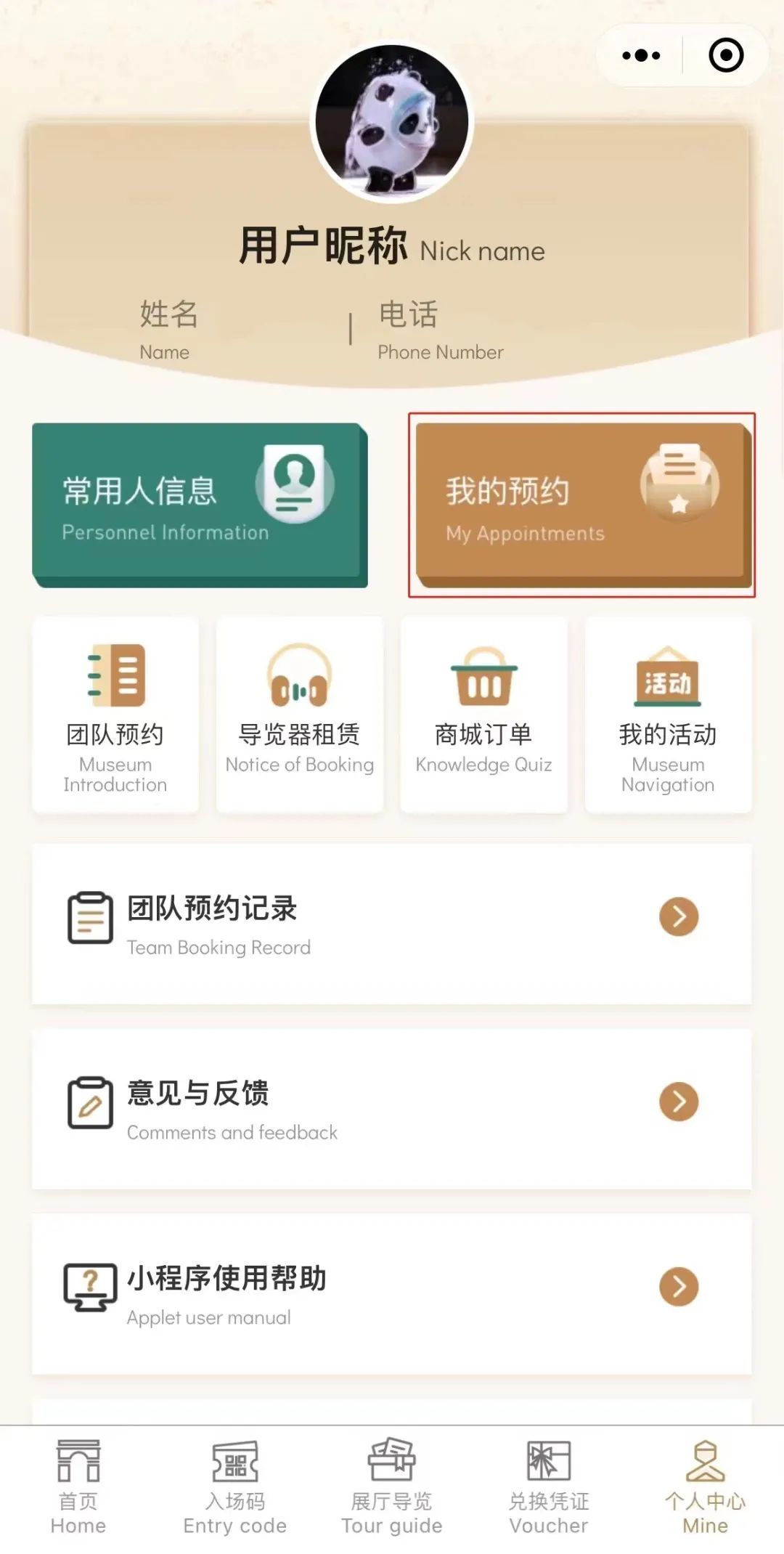 3.通过点击小程序底部进入“个人中心”查看以往预约记录,也可在此页面进行退票操作。需注意:二维码生效前2小时内不可退票(其余时间参观者都可在该页面进行自主退票)