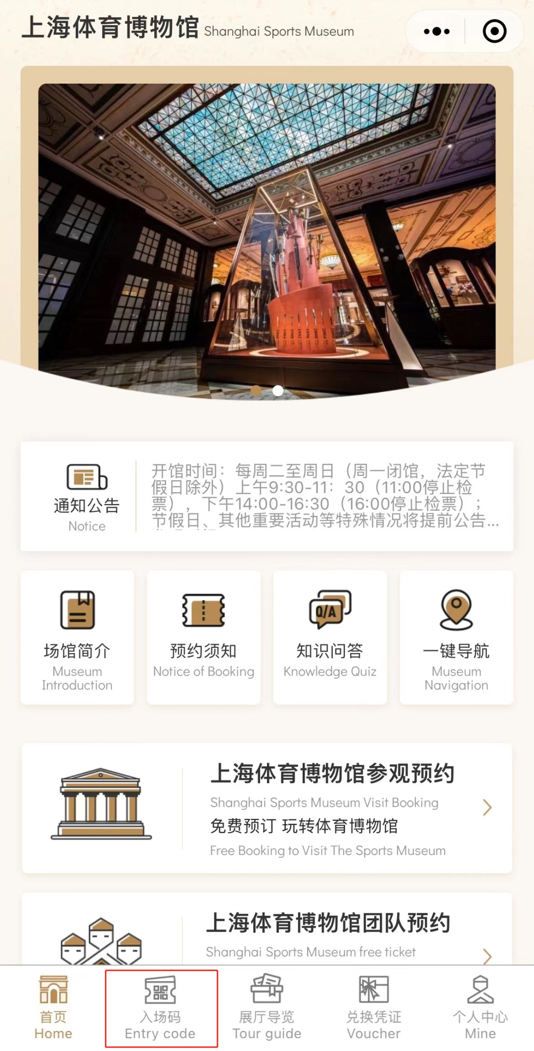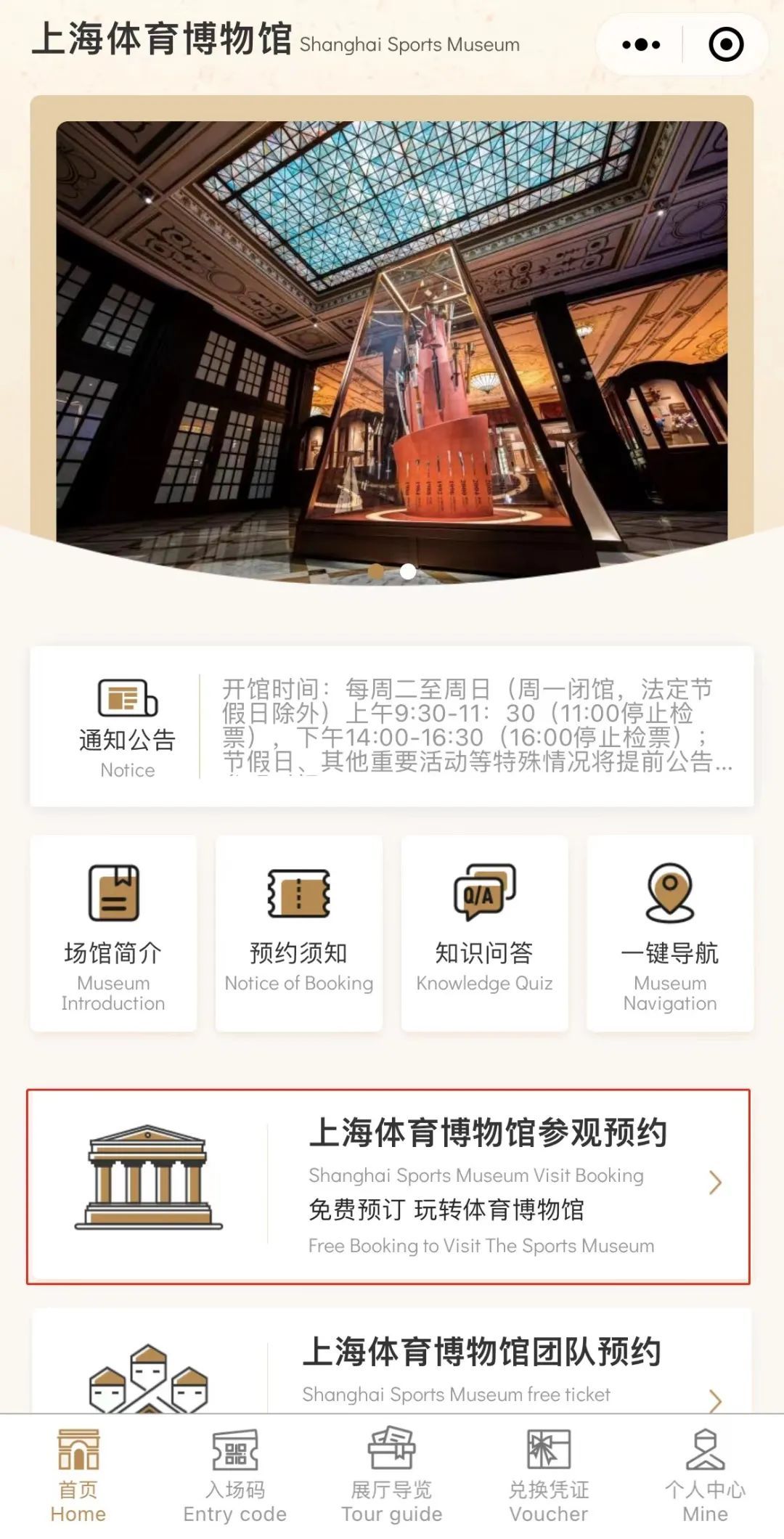 1.关注“上海体育”政务微信,点击下方微信小程序进行预约,请仔细阅读通知公告及预约须知。