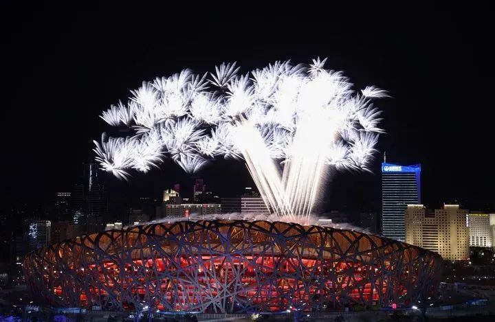 盛大的烟火从鸟巢顶上绽放