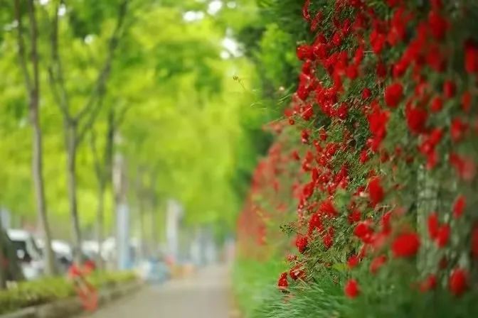 桂江路绿地月季花一团团、一簇簇,
