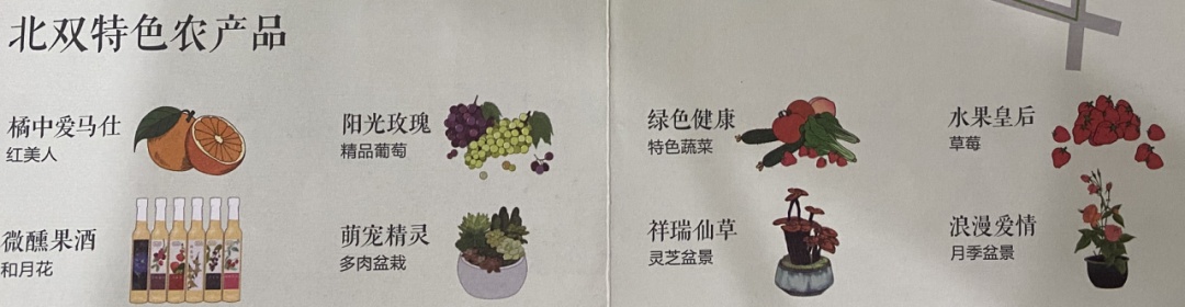 田间五鲜:田间鲜蔬,这里是蔬菜和水果种植采摘的地方,现提供观、采、食、带、认养等功能;田间鲜汁,这里主要种植了适合鲜榨的果蔬,游客可至鲜汁客栈品尝鲜榨果汁。田间鲜花,这里种植了307个品种的月季花,面积约20亩,集品种培育、科普教育、科研基地、月季观赏、月季文化传播等多项功能于一体。田间鲜果,这里主要种植可供采摘的时令水果,供游客来园采摘体验。田间鲜宿,这里融合了北双各种特色民宿与农家乐,供游客住宿体验。