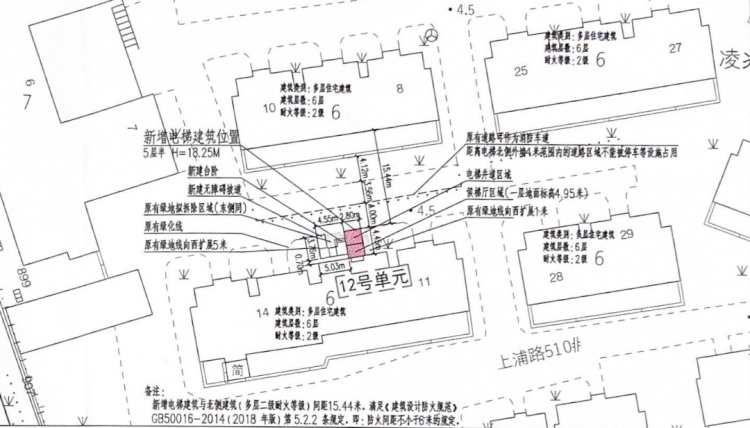 1.在12号单元楼梯间北侧外部增设无机房电梯一部(设5站,半层入户)。