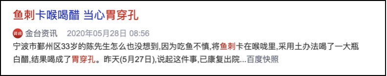 老人们还有一种土方法就是——喝醋。喝醋虽然能起到软化鱼刺的作用,但醋在喉咙的停留只是一过性的,很难真正起到效果。