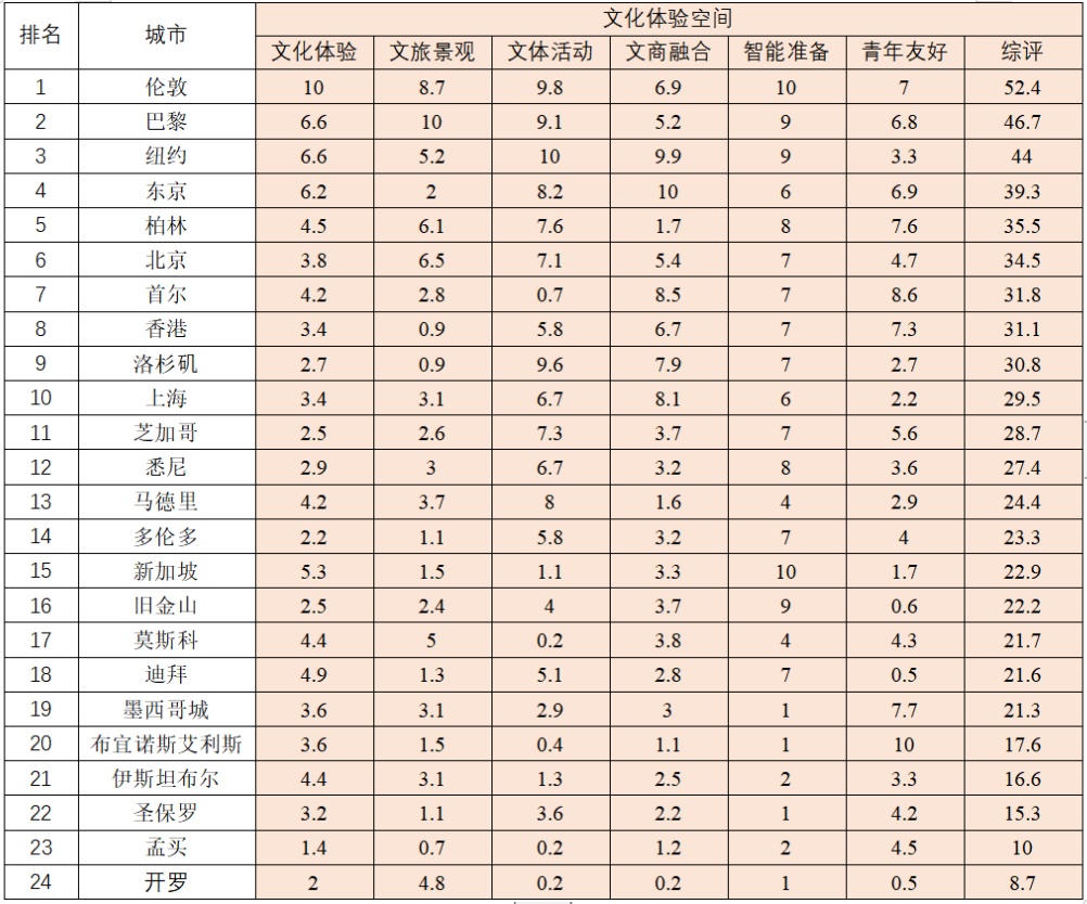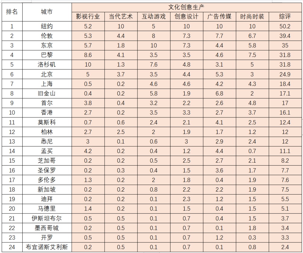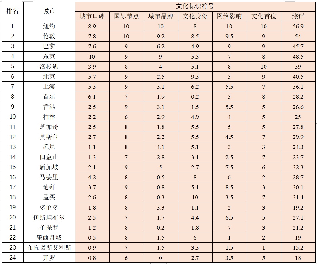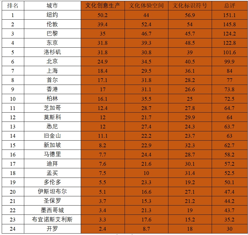 上海的结构性排名展示上海国际文化大都市的发展模式。