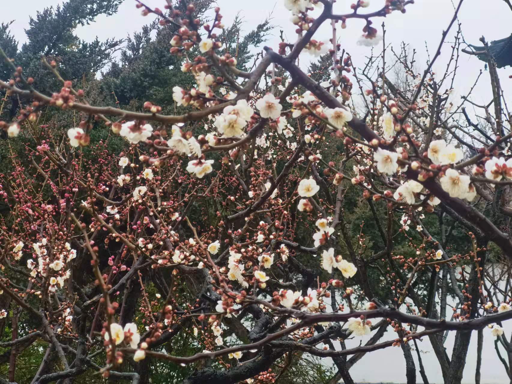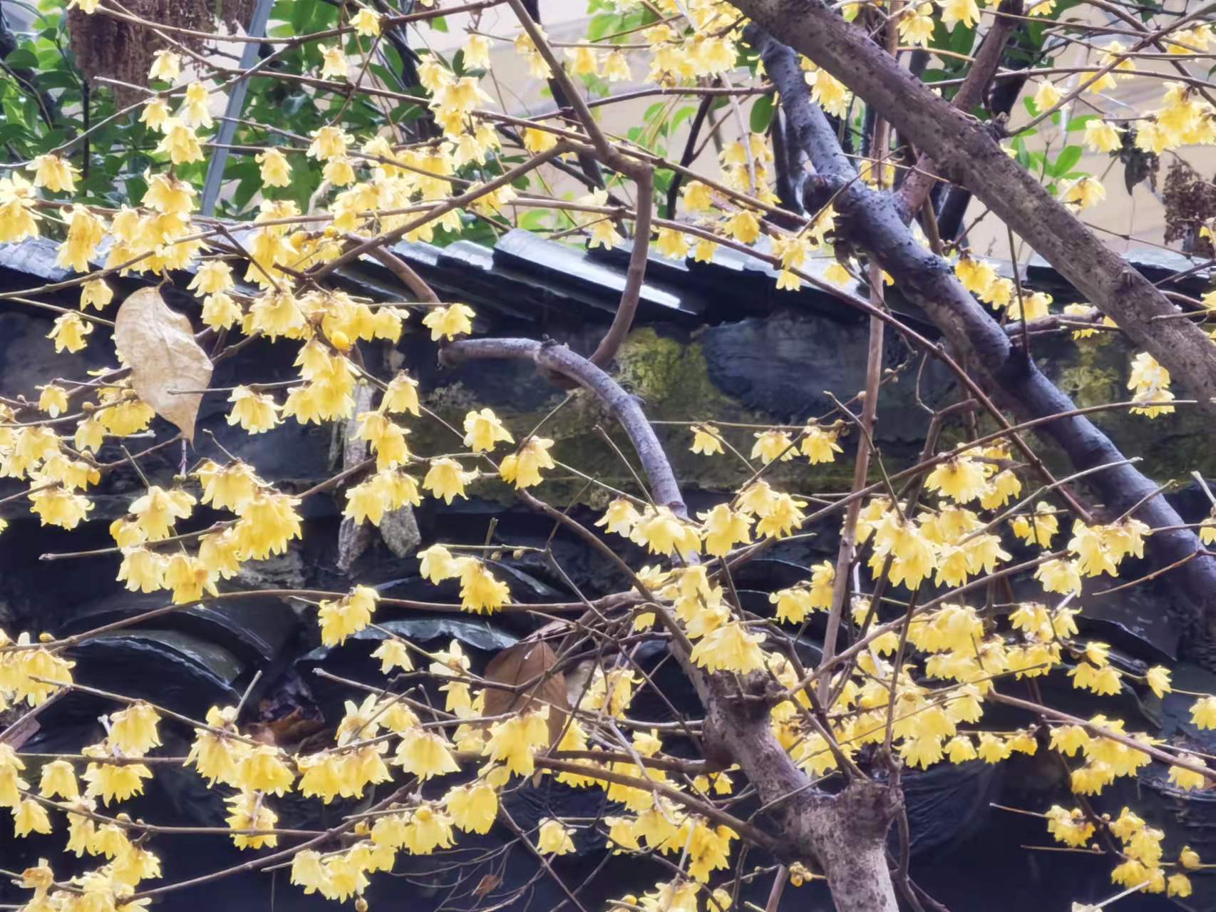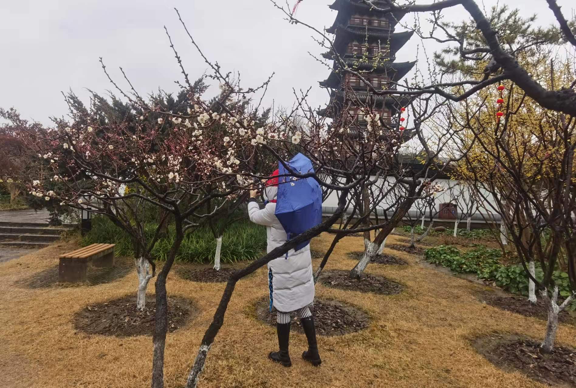 倚栏赏花,花香沁人心脾,享受冬日里别样的风雅与乐趣。眼下,上海方塔园内的蜡梅和梅花正竞相开放。