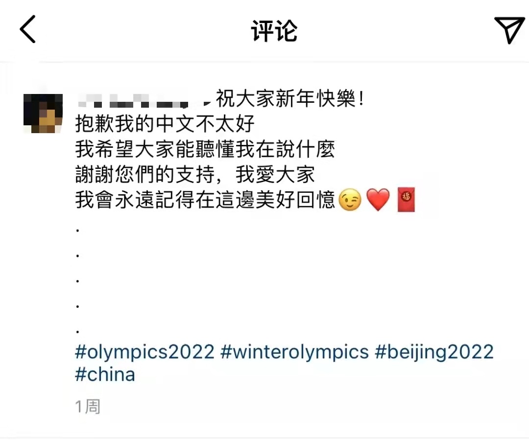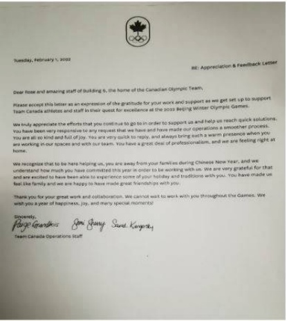 此外,加拿大奥运团队还写了一封感谢信给中国冬奥工作团队,表达他们的感激之情。信中写道:“我们了解,你们在中国新年期间远离家人,来到这里帮助我们。我们也了解,为了我们,你们在今年的工作中付出了多大的努力。我们对此非常感激,也很高兴能和你们一起体验你们的节日和传统。你们让我们感觉像家人一样,我们很高兴和你们建立了深厚的友谊。”