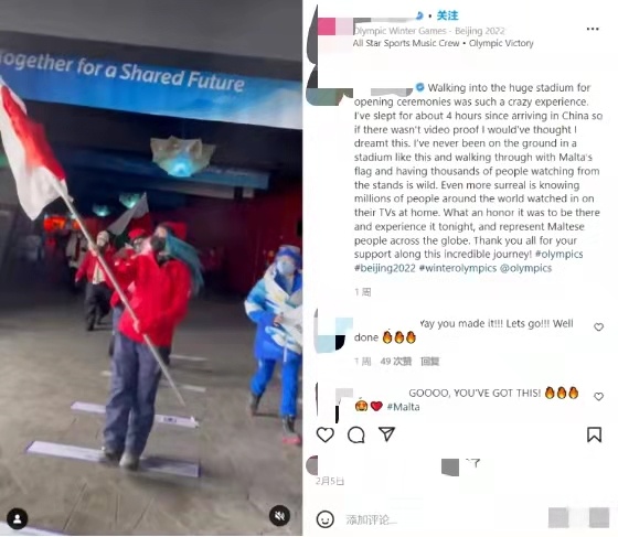“踏入这个巨大的体育场参加开幕式,真是疯狂的经历。来到中国后,我只睡了4个小时——所以如果没有视频,我简直觉得自己在做梦。能够亲身体验这这场盛会,是莫大的荣幸。”