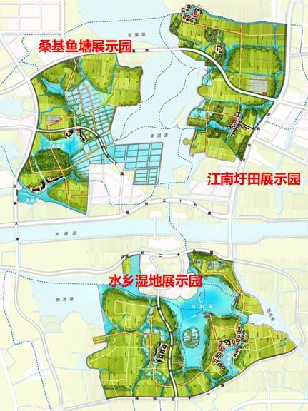 水乡客厅围绕“一点、一心、三园、蓝环”,即围绕长三角原点,打造方厅水院,构筑地标场所;围绕方厅水院,外围灵动布局三大核心功能组团,塑造新江南画卷;围绕现代生态技术与传统理水治水智慧相融合,打造江南圩田、桑基鱼塘、水乡湿地三个展示园及三个科普村;围绕串联水乡自然地理和人文风景建设示范区蓝环工程。