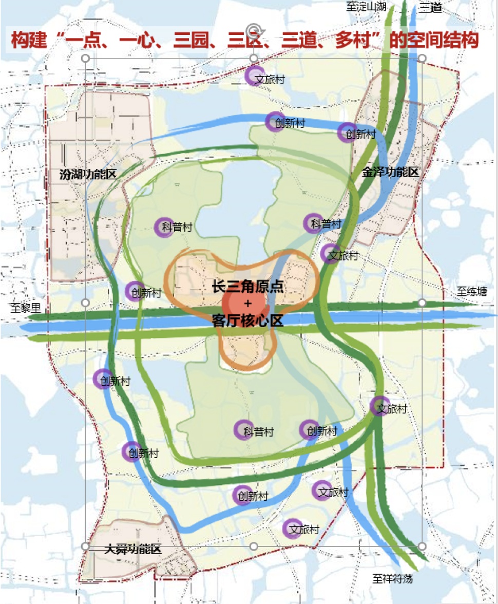围绕水乡客厅的建设,在上海青浦打造创智引擎,打造国际峰会、高端会议、创智研发、文化、水陆枢纽等功能;在江苏吴江打造科创策源,结合科研院所布置科创研发、科技孵化、会议会展、交流培训、商业服务、人才公寓等功能;在浙江嘉善打造会展策源等功能。