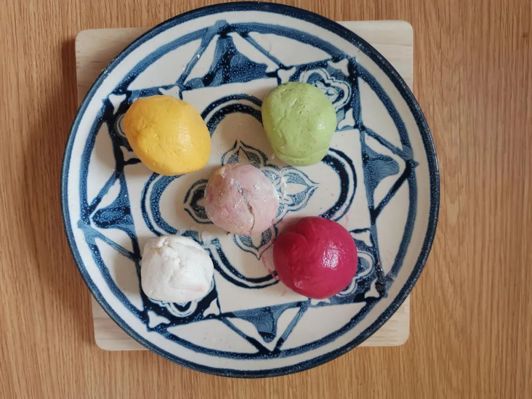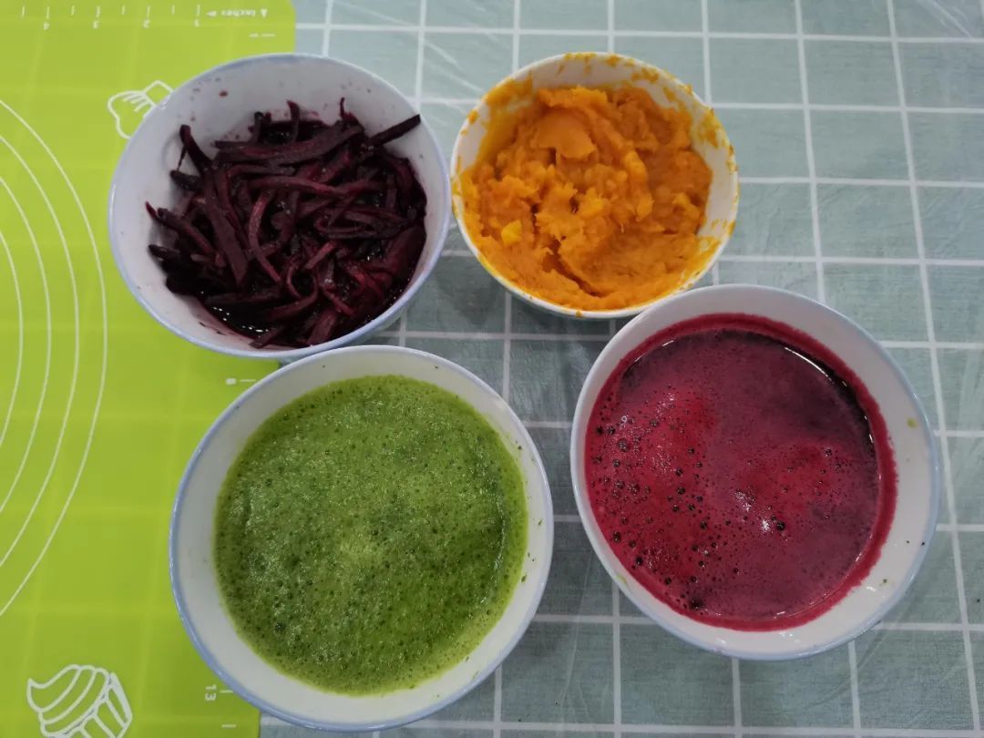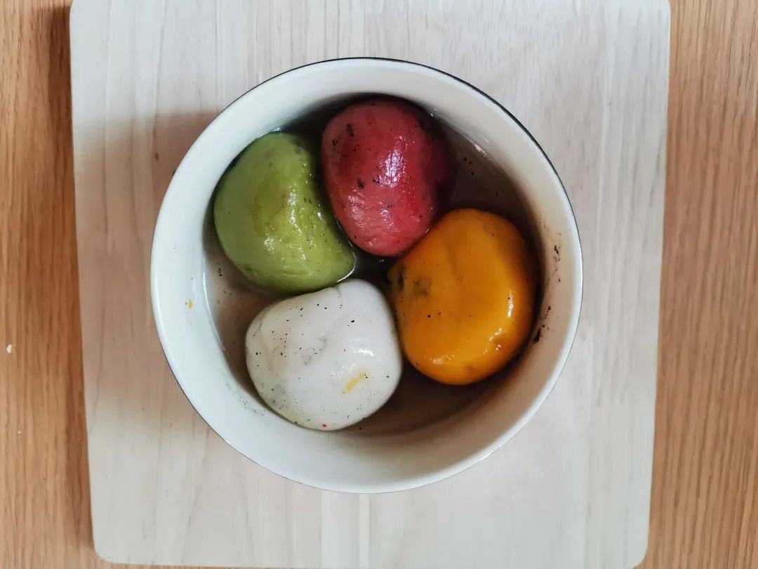甜菜根,菠菜,南瓜三种食材,配合糯米粉,豆沙,黑芝麻馅,不同颜色的汁水揉在糯米粉里,变成不同颜色的小面团。色彩缤纷的彩色汤圆不仅颜值超高,而且吃得健康。