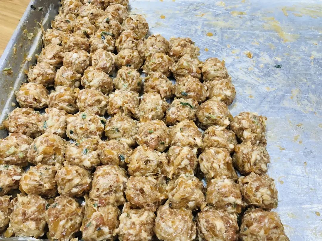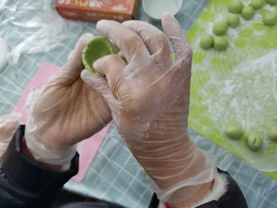 现场七八位手艺好的阿姨分工有序,有的和面团,有的分馅料,有的揉汤团,糯米粉的清香加上肉馅儿的清香,香气四溢,100多个圆滚滚的汤圆很快就包好了。