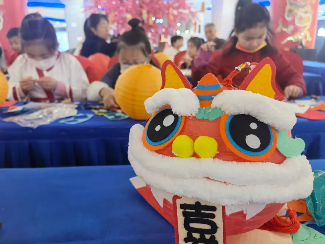 在老师的指导下,大家固定、组装好灯笼主体,再贴上眼睛、鼻子、耳朵、眉毛、胡须,挂上中国结等加以装饰,一个个活灵活现的“虎头”花灯就陆续诞生了。