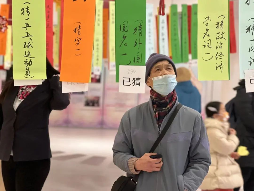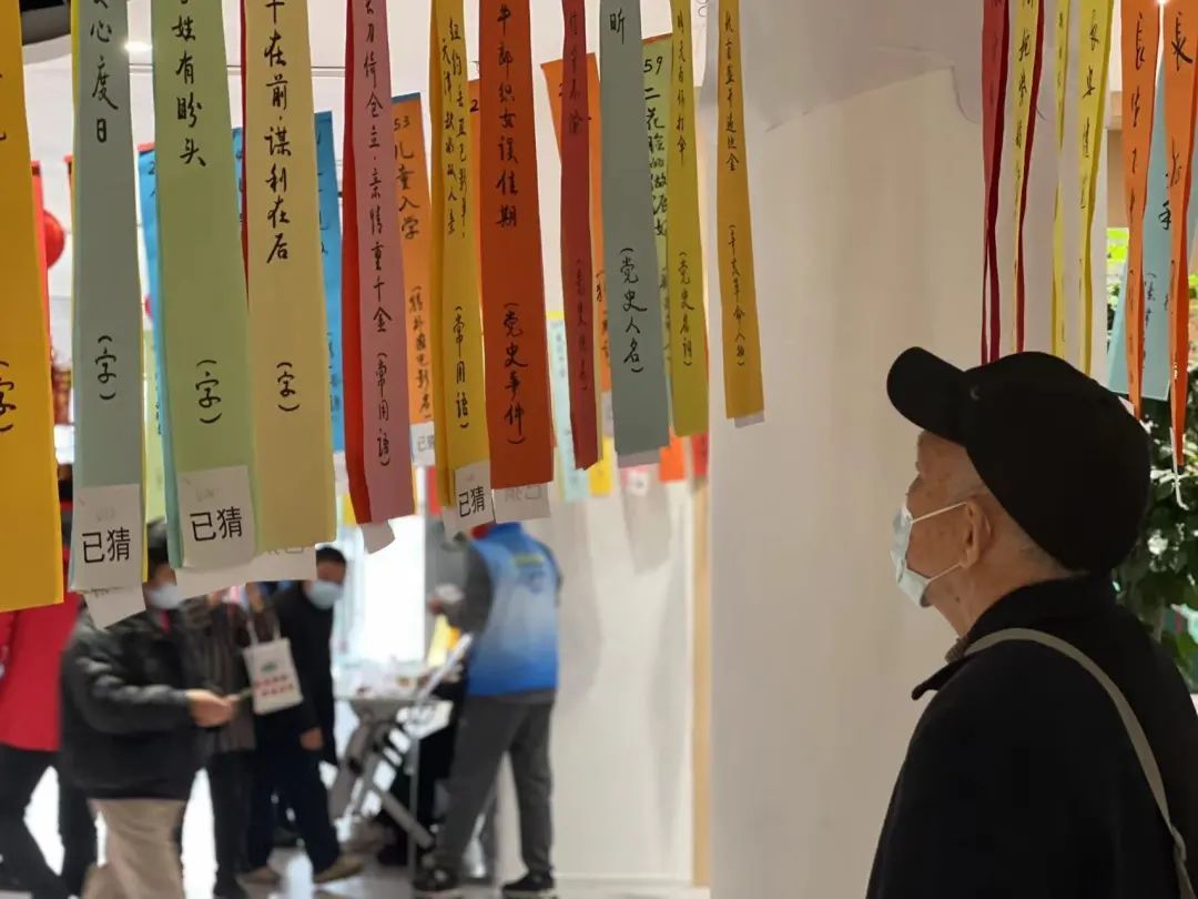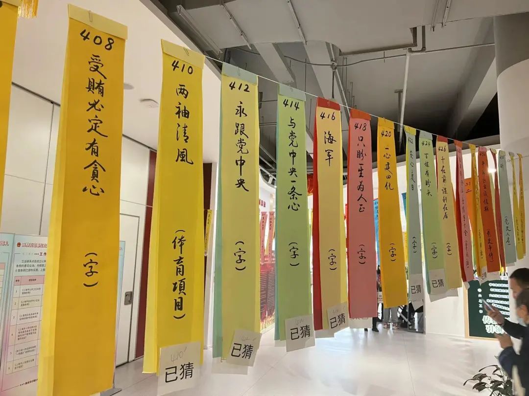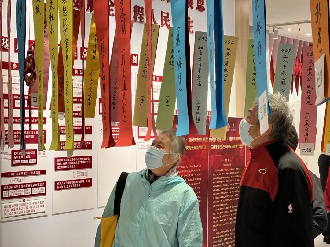 灯笼做好了,再来个传统的项目猜灯谜。中心大厅被五百余条手写灯谜“填满”,彩纸上书法写就的灯谜将精神文明建设、传统节庆文化等内容融入其中,通过无声的文字进行传达弘扬,既具娱乐性,又具知识性。