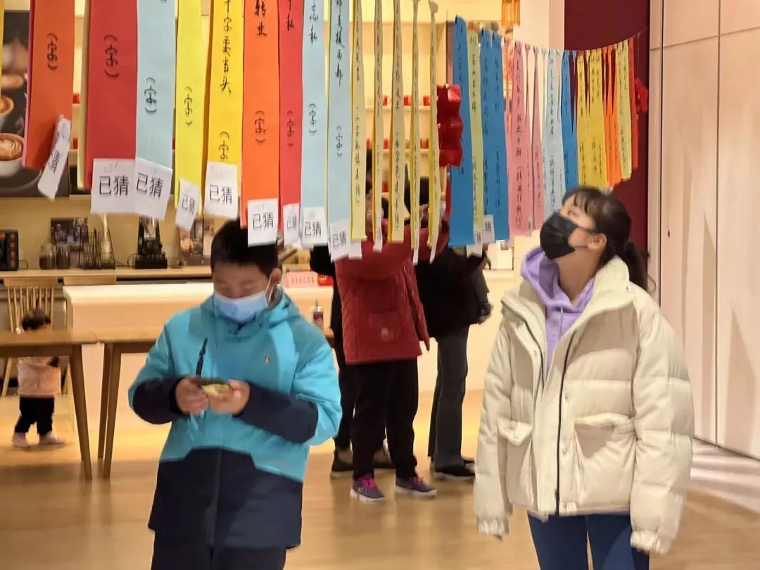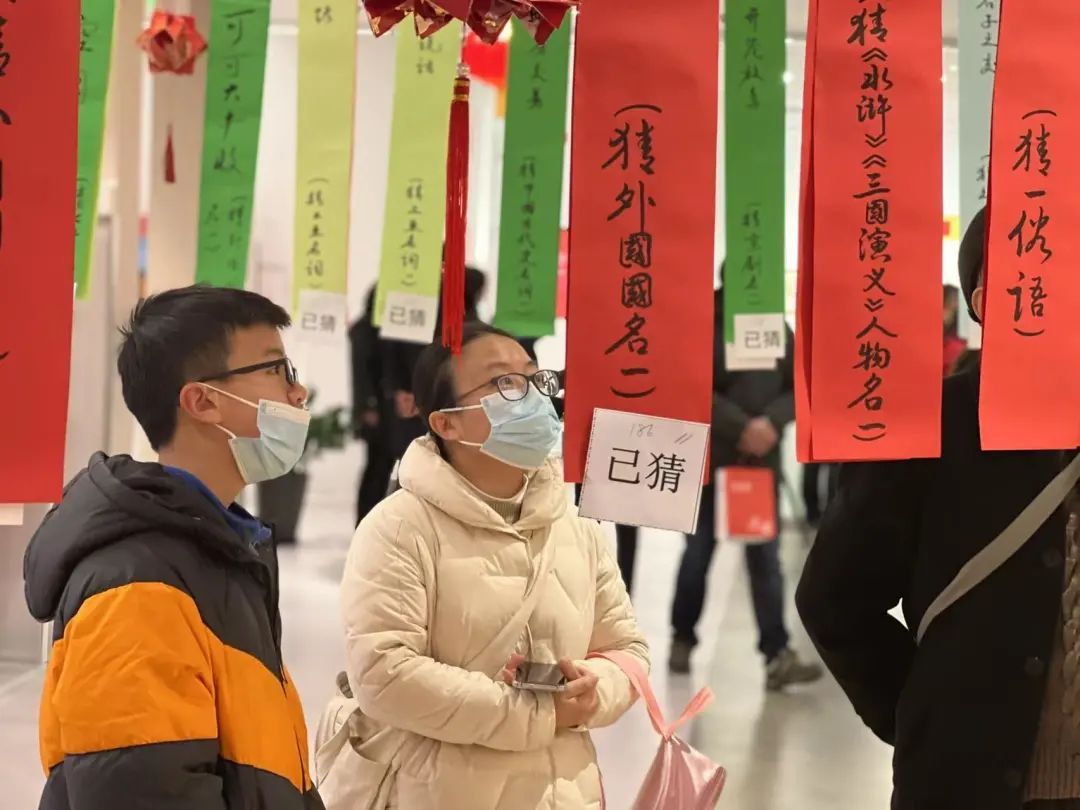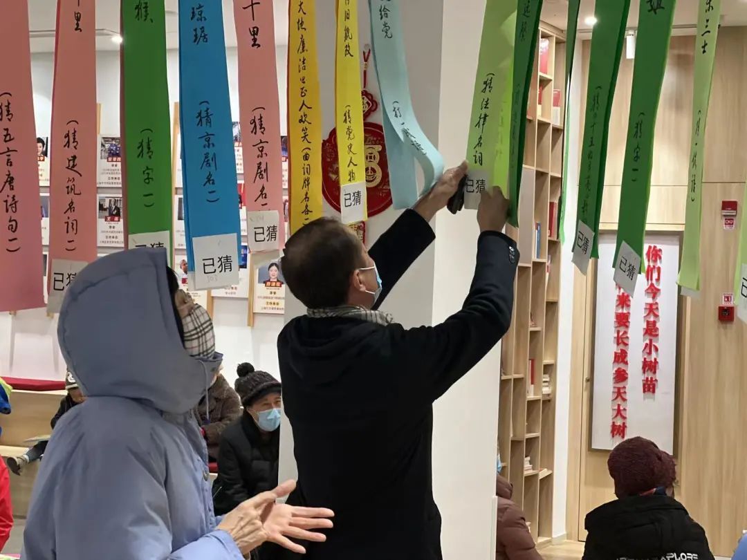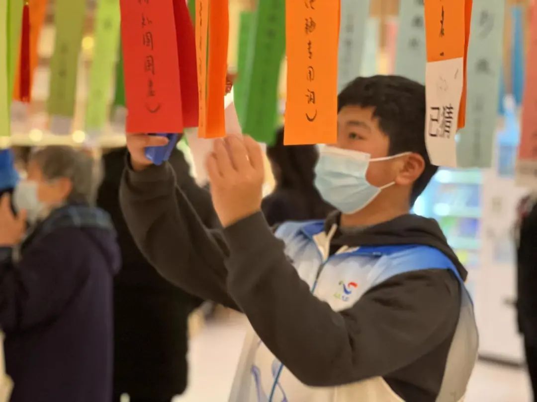 灯笼做好了,再来个传统的项目猜灯谜。中心大厅被五百余条手写灯谜“填满”,彩纸上书法写就的灯谜将精神文明建设、传统节庆文化等内容融入其中,通过无声的文字进行传达弘扬,既具娱乐性,又具知识性。
