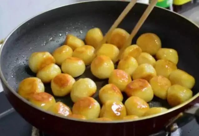 除了“擂沙”,“元宵”还可以干煎。经沸水煮熟的汤团倒在熟油锅中边搅边压,“元宵”就变成了金黄色的小圆球,令人垂涎欲滴。