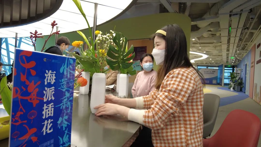 另外一边,偏好文静淡雅的白领们则体验了传统文化的静雅,用龙泉青瓷做一个吊坠、用一堆鲜花插出错落有致的瓶栽,体验新奇还能带回去装饰。