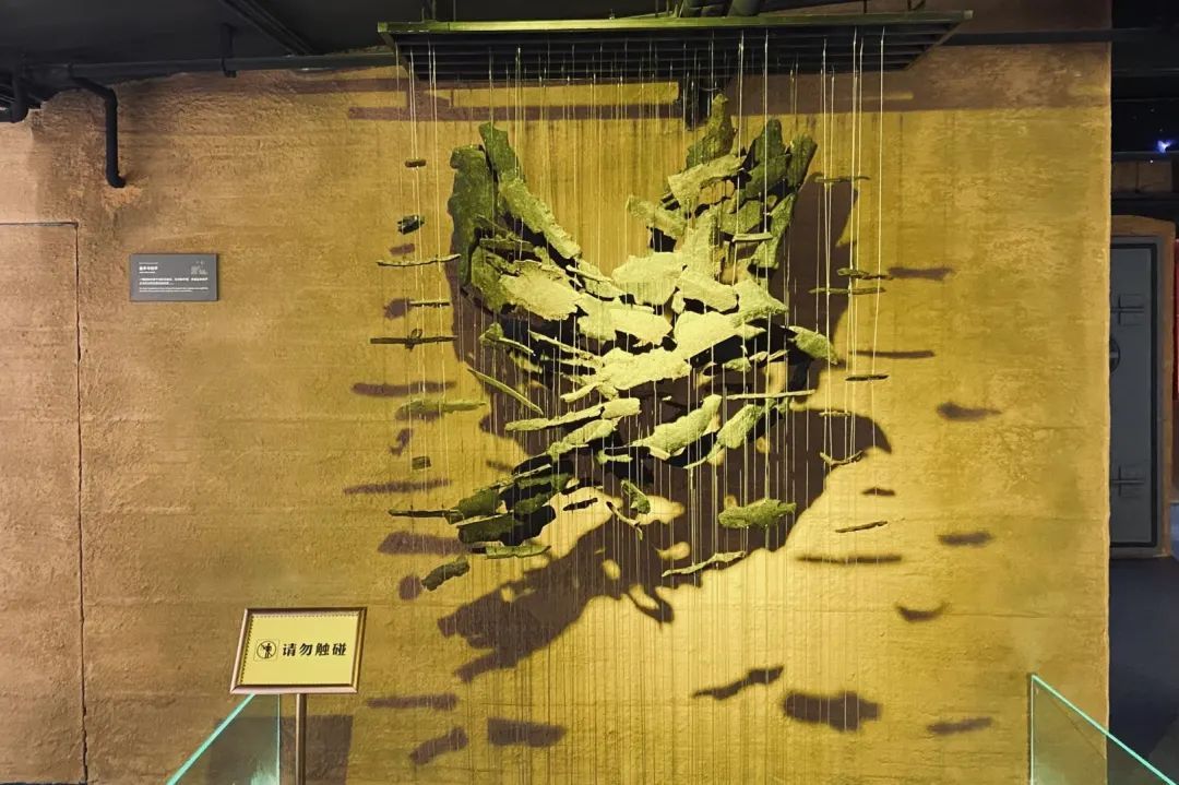 一块块悬挂的破碎弹片吸引了记者的注意,在灯光的照射下,墙上投影出和平鸽的形状。工作人员告诉记者这一块块碎片,都是从重庆的战斗遗址中挖掘出来的真实弹片。作品名为和平之光,弹片化身和平鸽,表达战争中人们对和平的渴望。