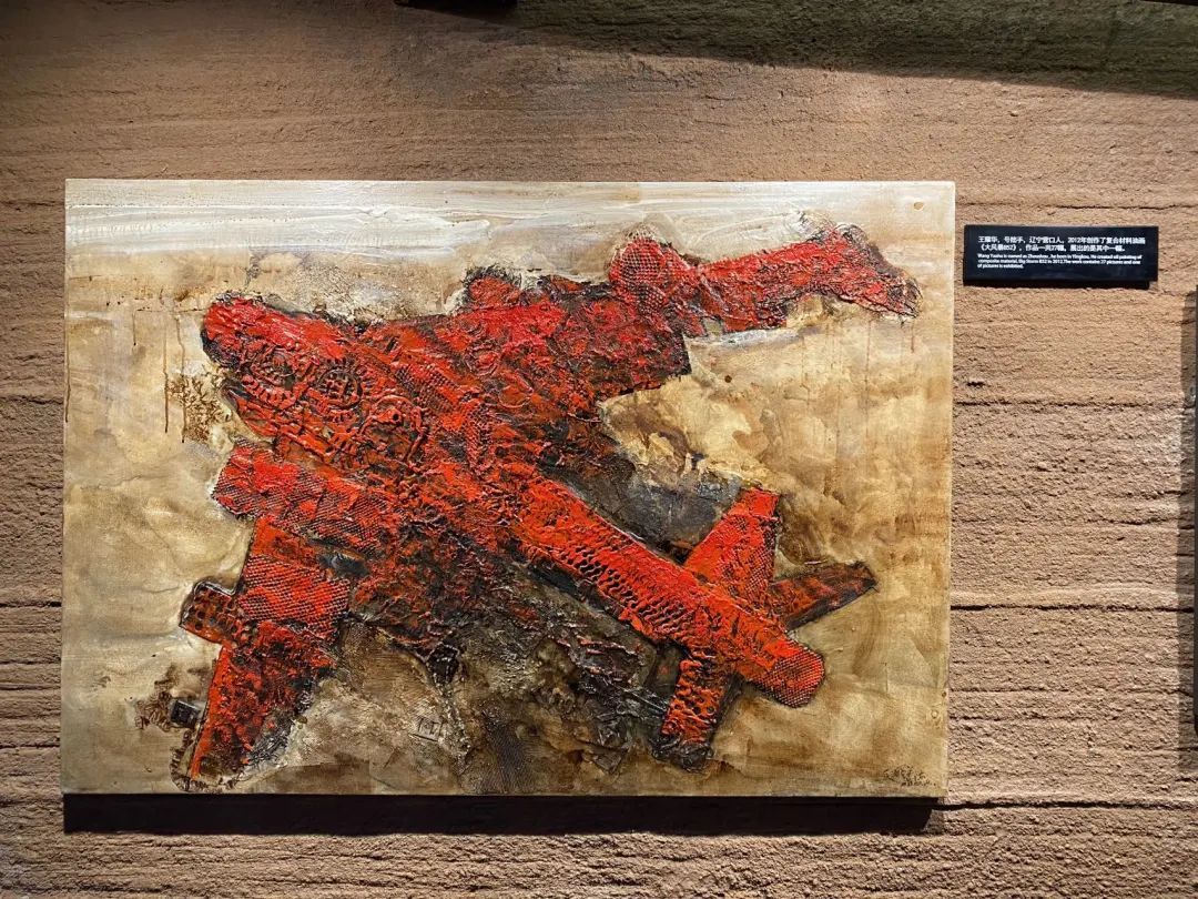 展馆内有一幅红色的飞机创意画作,展现美国至今还在服役的轰炸机B-52。这幅作品是由M50创意园内艺术家王耀华先生创作。据M50园区工作人员介绍,“得知此处的民防设施将被改建成艺术展馆,艺术诠释民防的想法让人眼前一亮。我们牵头园内艺术家,征寻相关艺术作品,这幅就是由此而来。”