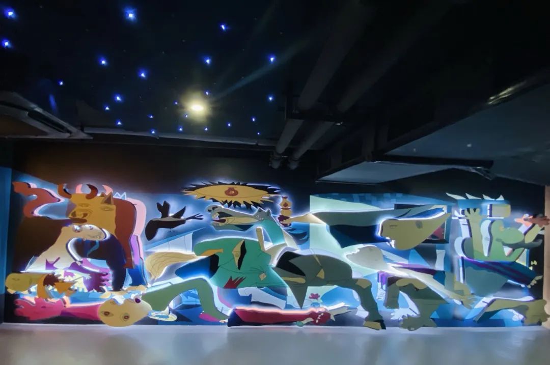 楼梯走到底是一幅巨大的立体作品,设计师向记者介绍说,“民防不仅仅是中国特有的,而是全球共有的话题。从国际视野的角度出发,我们团队想到了这幅毕加索的作品《格尔尼卡》。格尔尼卡是西班牙的一个城市,曾在那里发生了人类历史上第一次针对平民的、地毯式的轰炸。我们用铝板雕刻画的技术,把这幅画所表达的支离破碎的感觉,用立体的方式予以放大,警示世人战争的残酷。”
