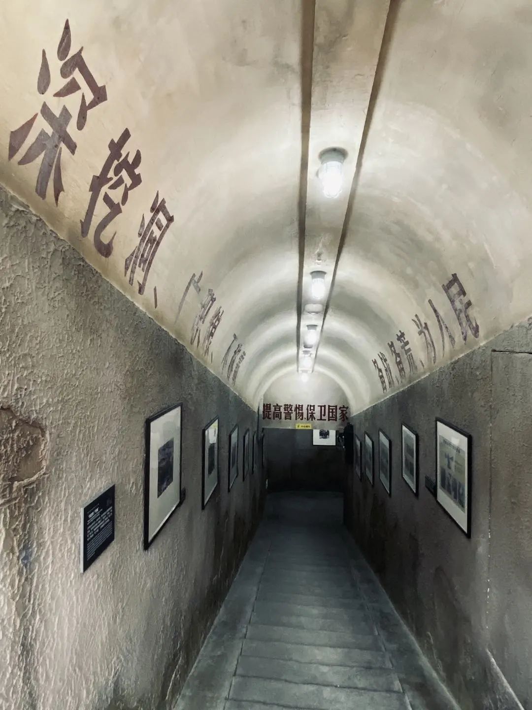 一进门是一段通往地下的台阶,展馆将通往地下空间的楼梯设计成建筑前身地下防空洞的环境,两侧的老照片和宣传海报都是那段历史的真实写照,仿佛一个时空隧道,带领人们回到“深挖洞,广积粮”的那个年代。