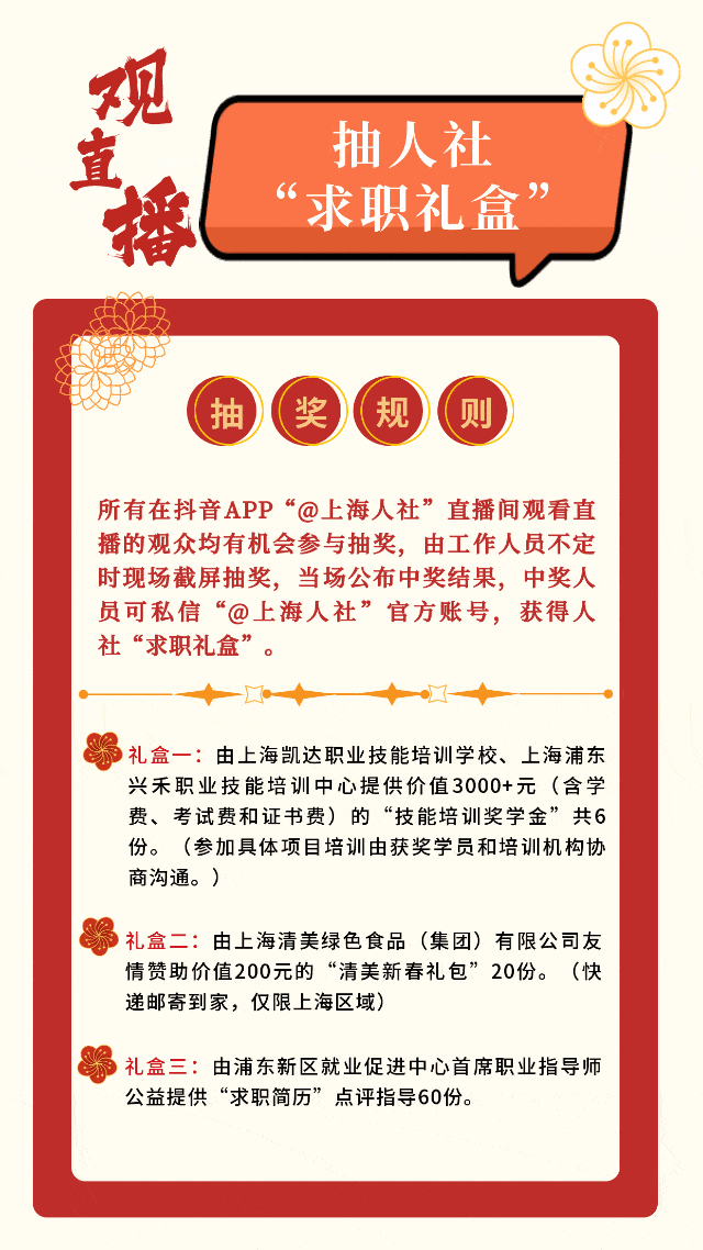 新春就业“开门红”——2022年浦东新区“就·在浦东-春风行动”线上招聘会暨“edjob工作室”浦东新区街镇全覆盖行动启动仪式及临港新片区企业“直播带岗”活动即将于2月18日上午9点半正式举行。你只要在当天参与“上海人社”抖音直播间“直播带岗”活动,就有机会免费抽到价值3000元+的“技能培训奖学金”(6份)、价值200元的清美食品礼包(20份)等人社“求职礼盒”!