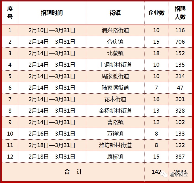2月10日至3月31日期间 ,浦东新区36个街镇在“浦东就业”公众号“edjob直播间”开展“2022年浦东新区‘就·在浦东-春风行动’网络招聘会”,推出 近700家用人单位提供的5000多个招聘岗位 。