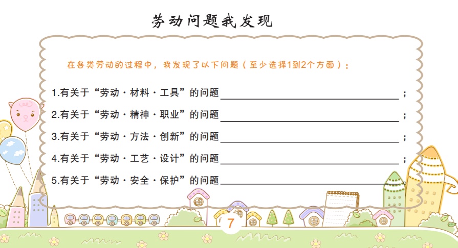 在“劳动探究”板块,同学们可以围绕“我和爸妈共劳作”“居家劳动我承担”“新年佳肴我掌勺”“春节年货我采办”“温馨小家我装扮”等主题开展劳动实践活动。通过“劳动问题我探究”活动,“材料·工具、精神·职业、方法·创新、工艺·设计、安全·保护”五个维度深入探究劳动问题,形成问题链,然后逐一进行破解。