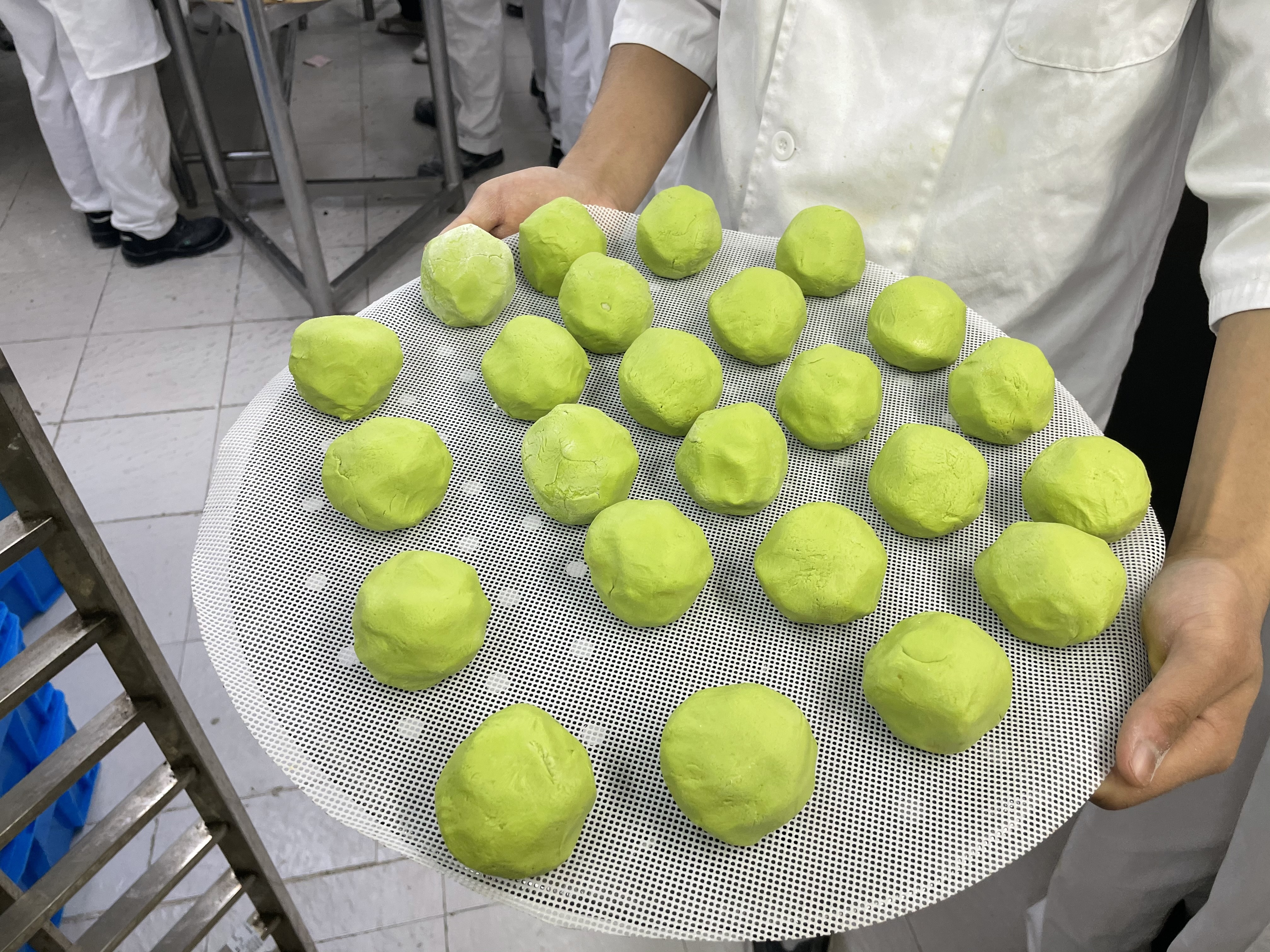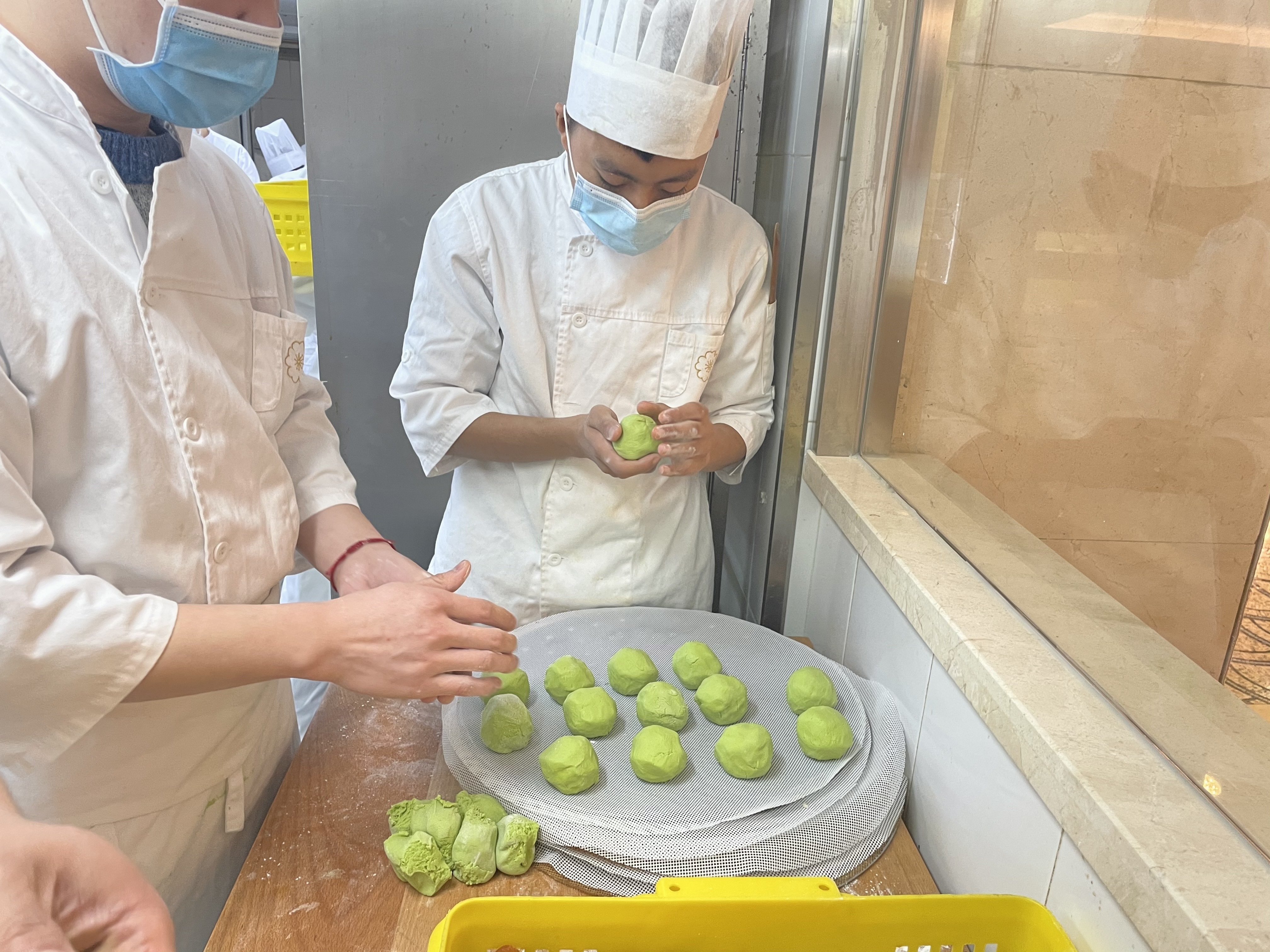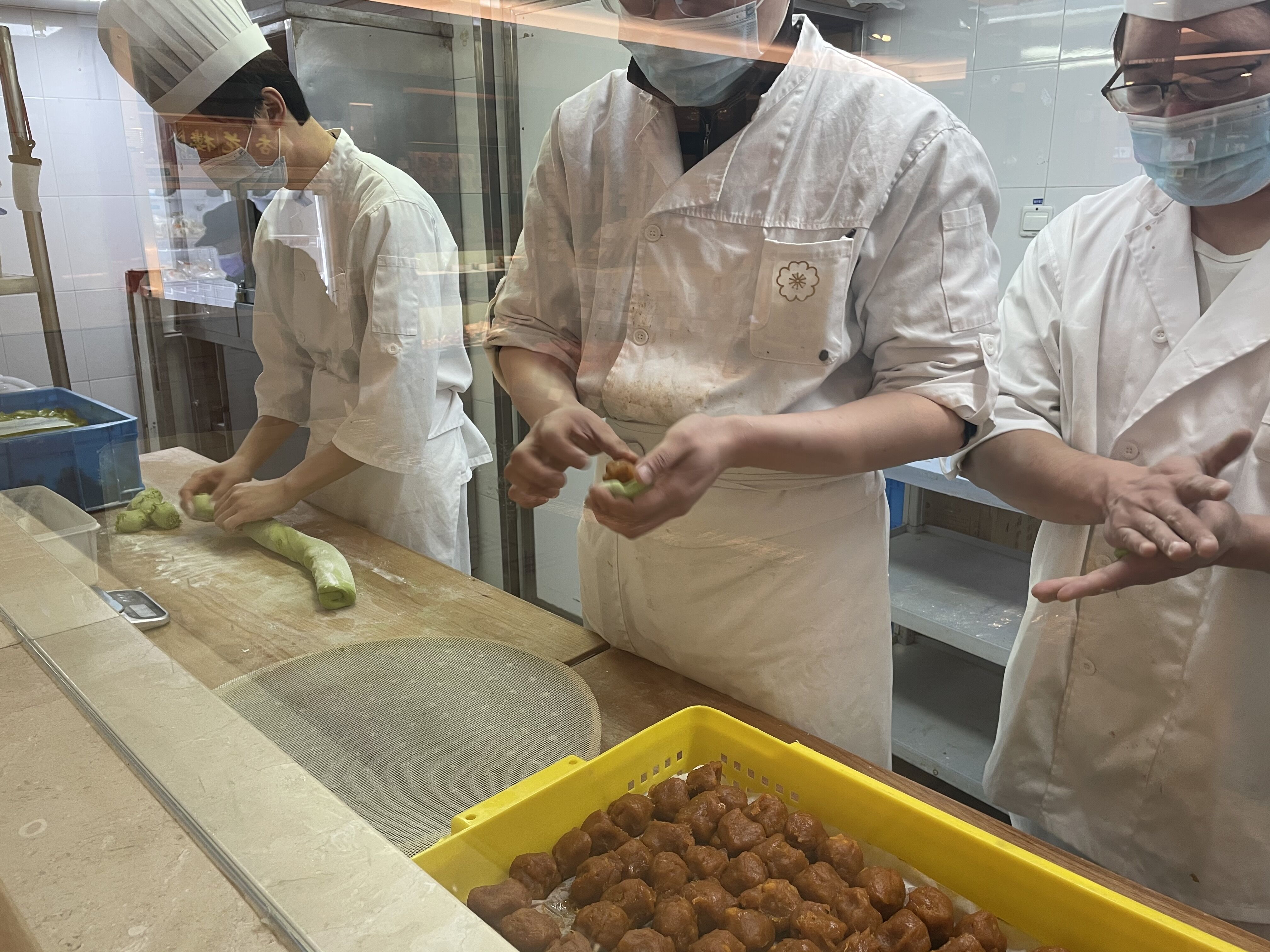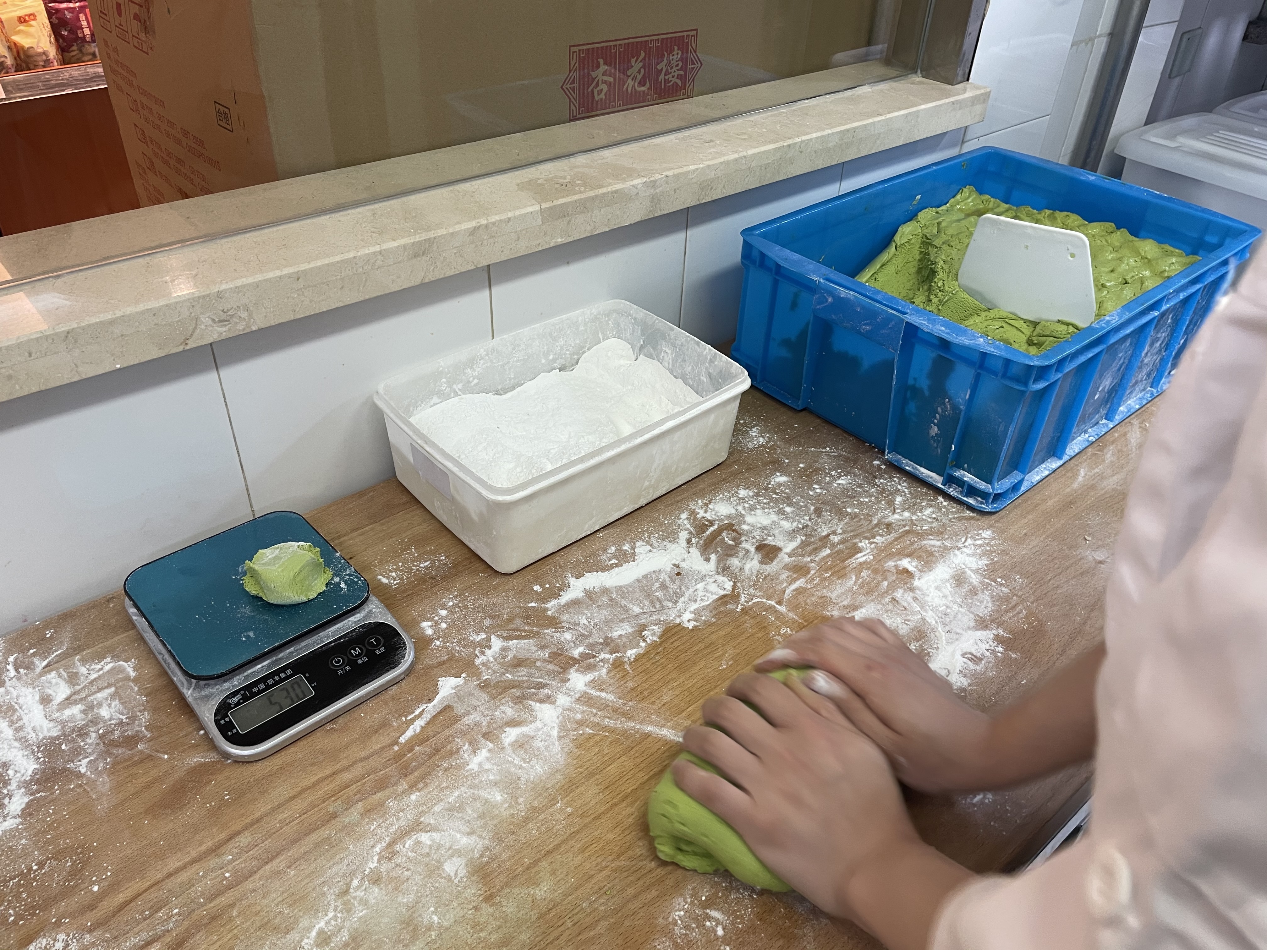 通过透明玻璃,记者看到杏花楼的后厨间内,几位技师正在热火朝天地制作青团。青团技师负责人表示,今天预计制作4000只左右的青团,接下来产量将逐步走高,他们也会“全员上岗”包青团。