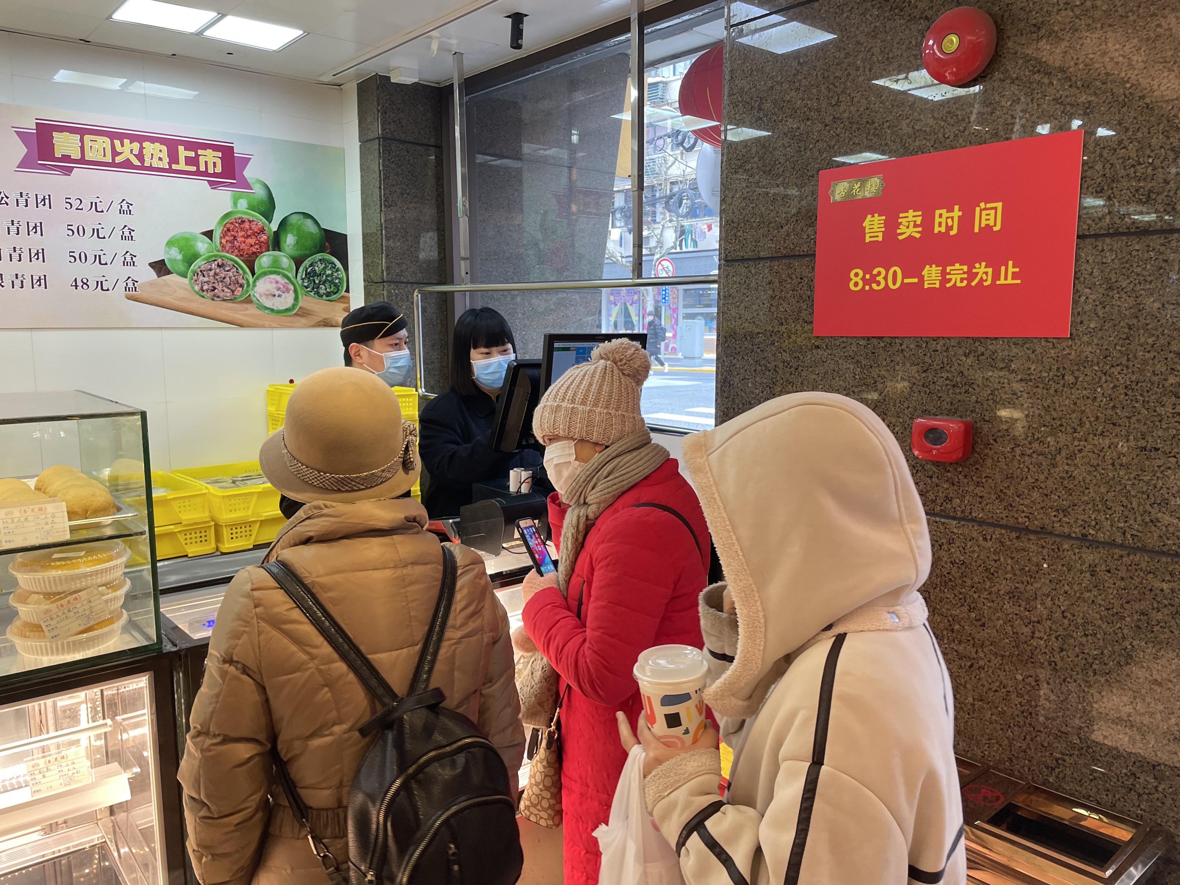 由于是上市首日,因此购买的消费者并不算多。李阿姨告诉记者,“今天是过来买馒头的,正好看到青团在卖,就给家里人带一盒咸蛋黄肉松的回家尝鲜。由于前些日子吃了不少汤团,所以这段时间还是决定少吃点糯食。”