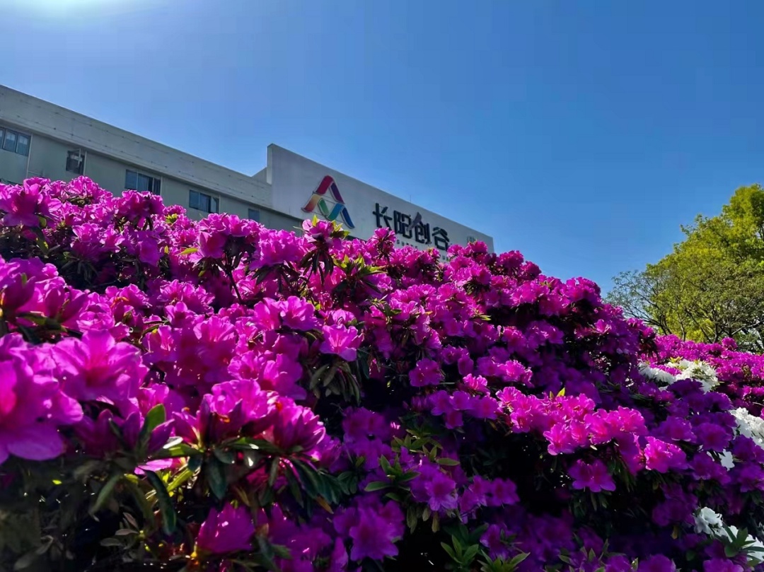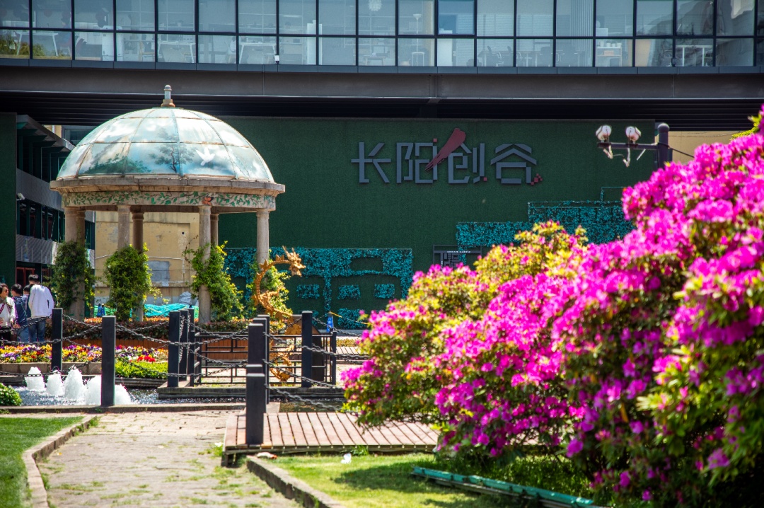 在长阳创谷东北角还有一片果园,栽有杨梅、枇杷、橘子、葡萄…… 园区里见空植树、见缝插绿,香樟、梧桐、杨柳等乔木为园区挡风遮雨,杜鹃、月季、茉莉等花卉为园区增色添香。工作者们每天步行穿过“丛林”和“口袋公园”上班,百年厂房的工业气息,随着绿叶清香,弥漫在阳光下。