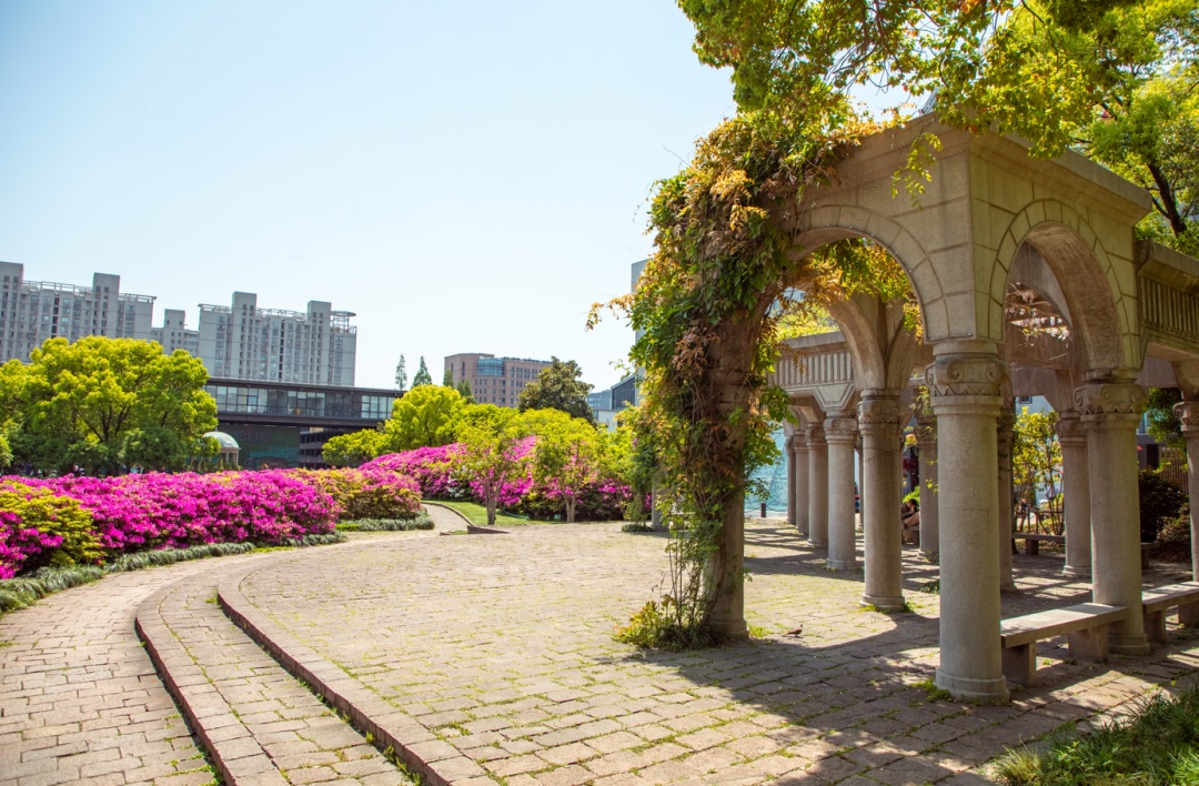 绿色是长阳创谷的主色调,园区中有一片占地7000平方米的中央绿地,长阳创谷的一期、二期、三期园区就围绕着绿地建成。绿地上不仅有莲花池,还有巴洛克风格的凉亭和座椅。