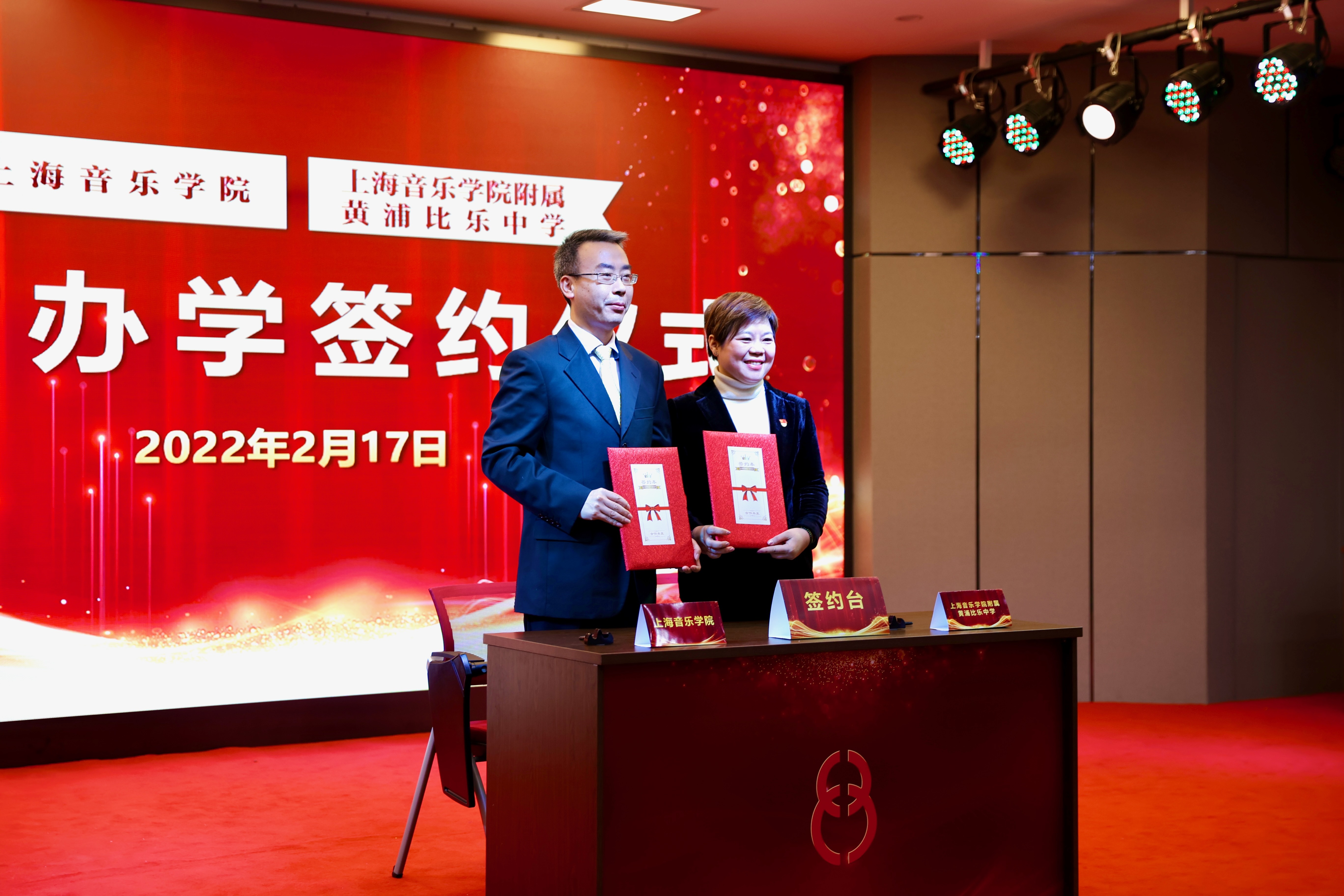2月17日上午,上海音乐学院附属黄浦比乐中学正式揭牌,并与上海音乐学院签署了合作办学协议。黄浦区委书记杲云,上海音乐学院党委副书记、副院长徐卫,黄浦区委常委、宣传部长王玉峰,上海市中华职业教育社常务副主任、上海市政府参事胡卫,黄浦区副区长袁园,上海音乐学院党委常委、副院长冯磊共同为“新比乐”揭牌。