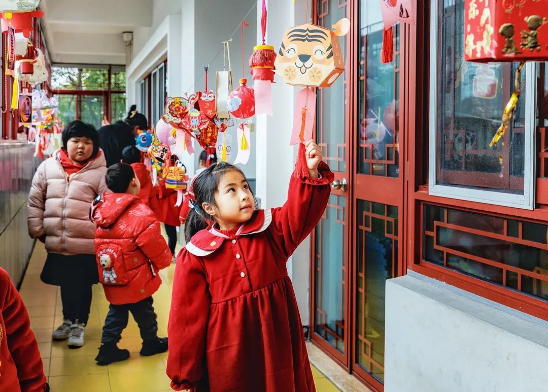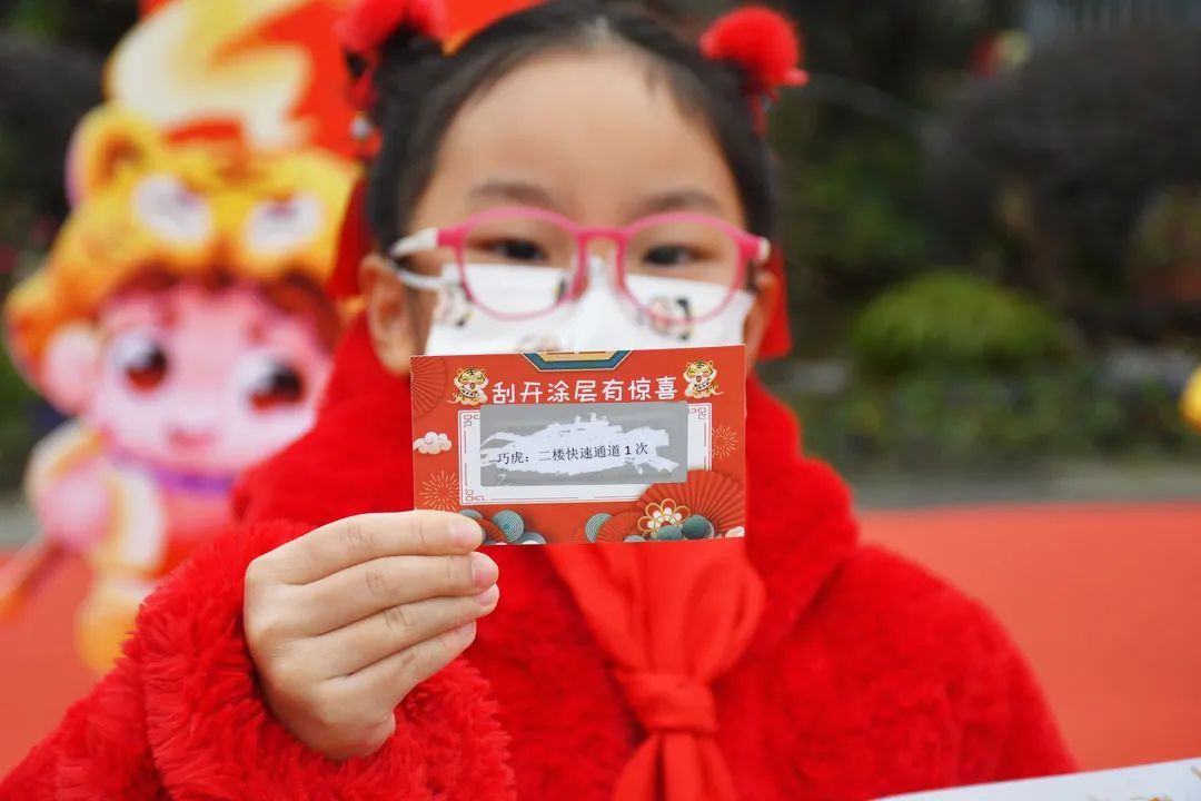 未进校门,先得福卡。早上7时刚过,九亭三小校门口已经热闹起来,喜欢做手工的“巧巧虎”和爱玩游戏的“乐乐虎”笑眯眯地忙着迎接孩子们回校,一群由学生扮演的“小老虎”则为同学们发“福卡”和“寻宝地图”。刮开“福卡”,玩具、糖果、游园快速通道券等让学生们乐开了花;随后,跟着“寻宝地图”去闯关,每个关卡都藏着惊喜与感动。