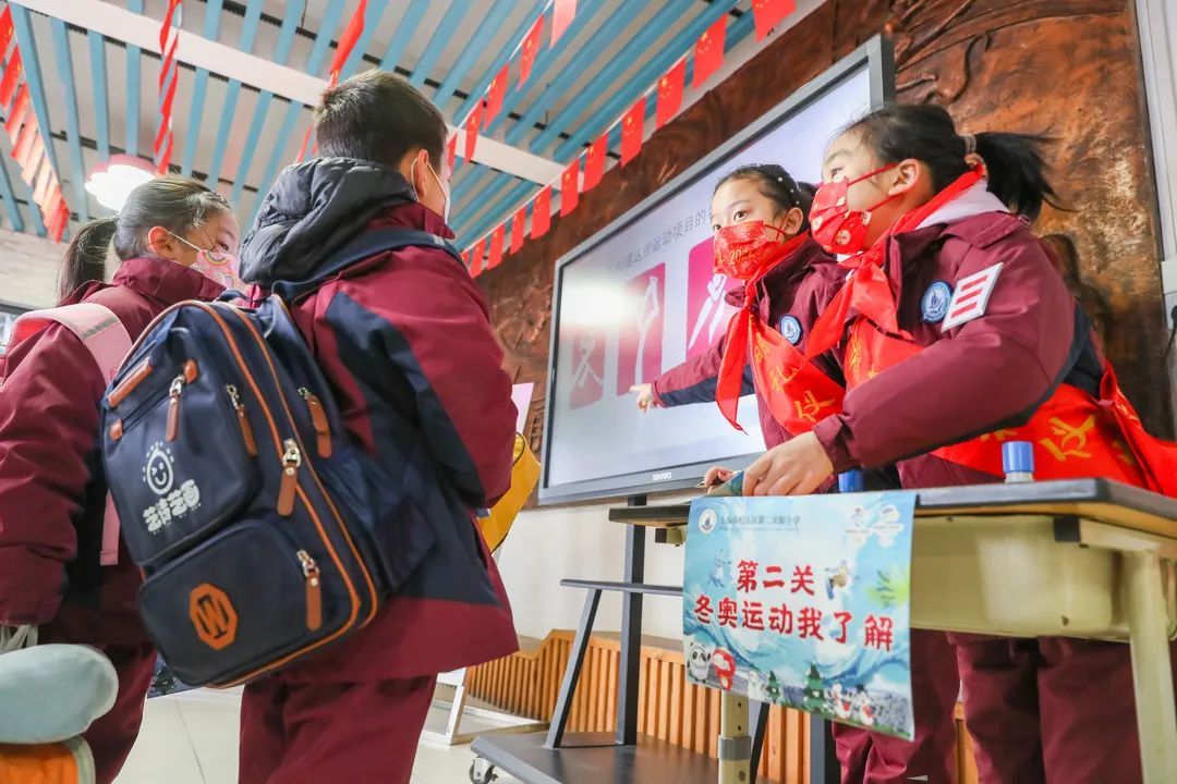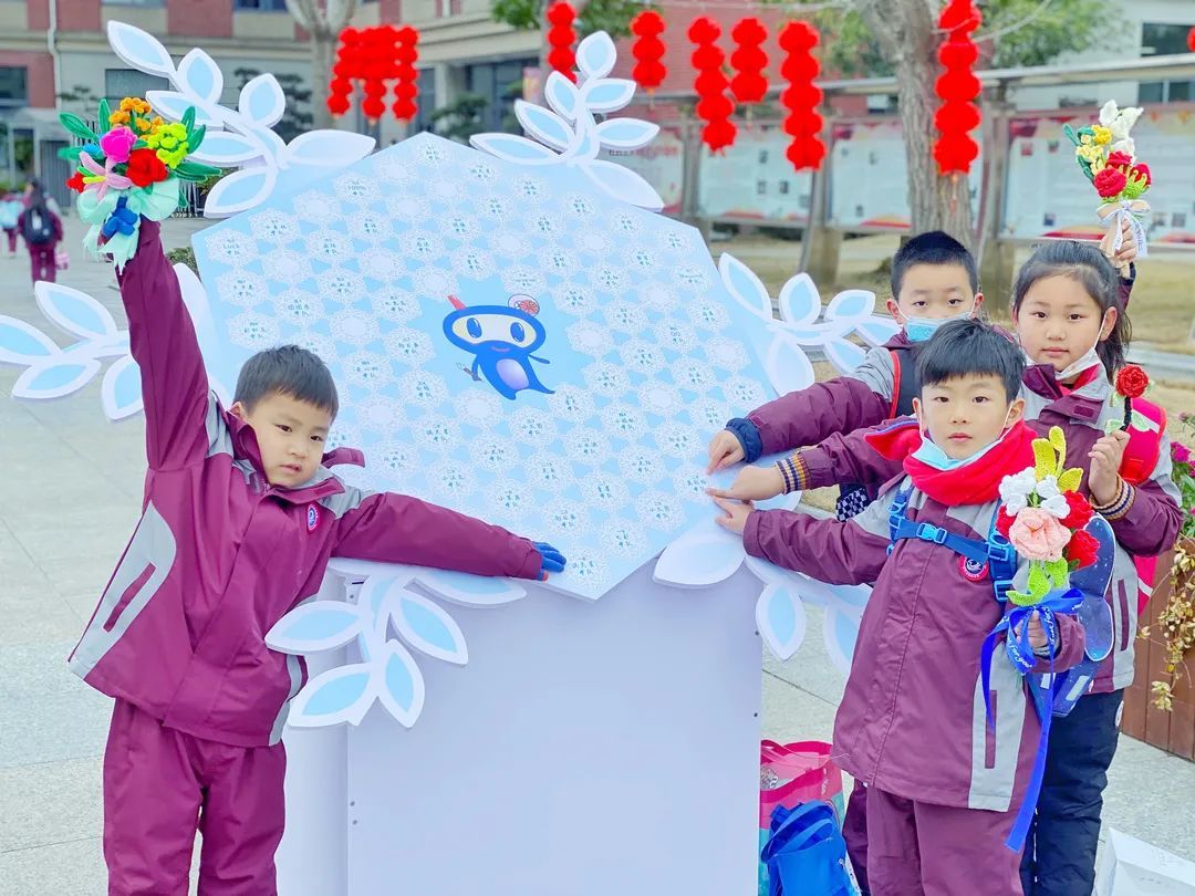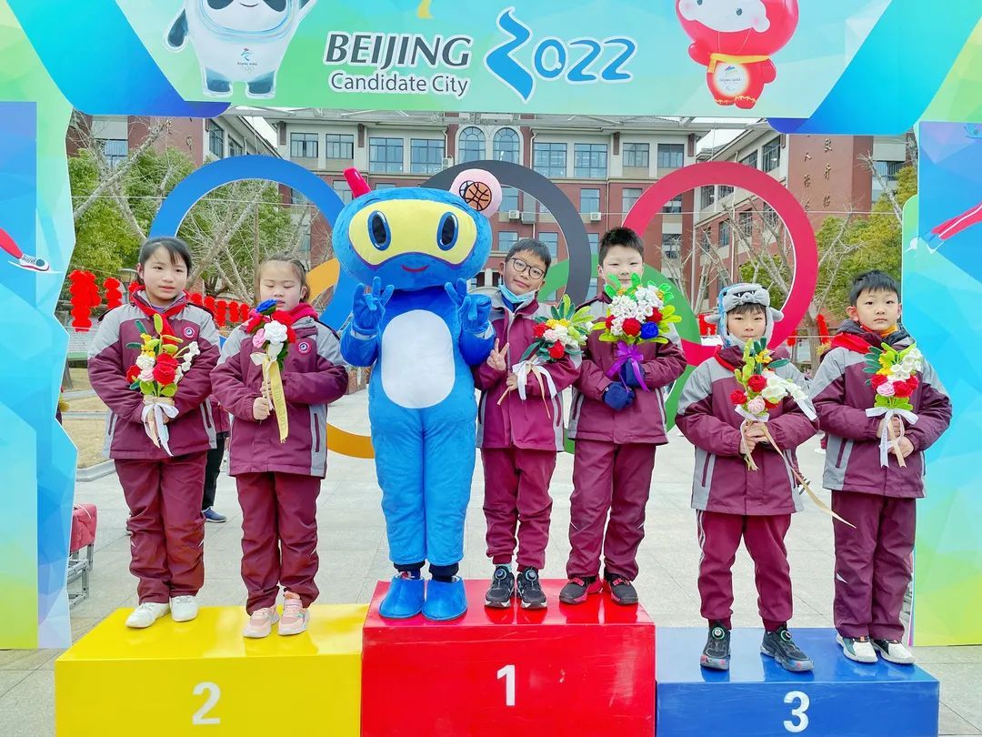 “哇!冰墩墩!雪容融”“哇!奥运五环!”孩子们一进校门,就被充满冬奥氛围的校园吸引,迫不及待地将精心准备的冬奥会颁奖花束和校园运动会上获得的奖牌拿了出来,自豪地站上了颁奖台,与校园吉祥物小智合影留念。