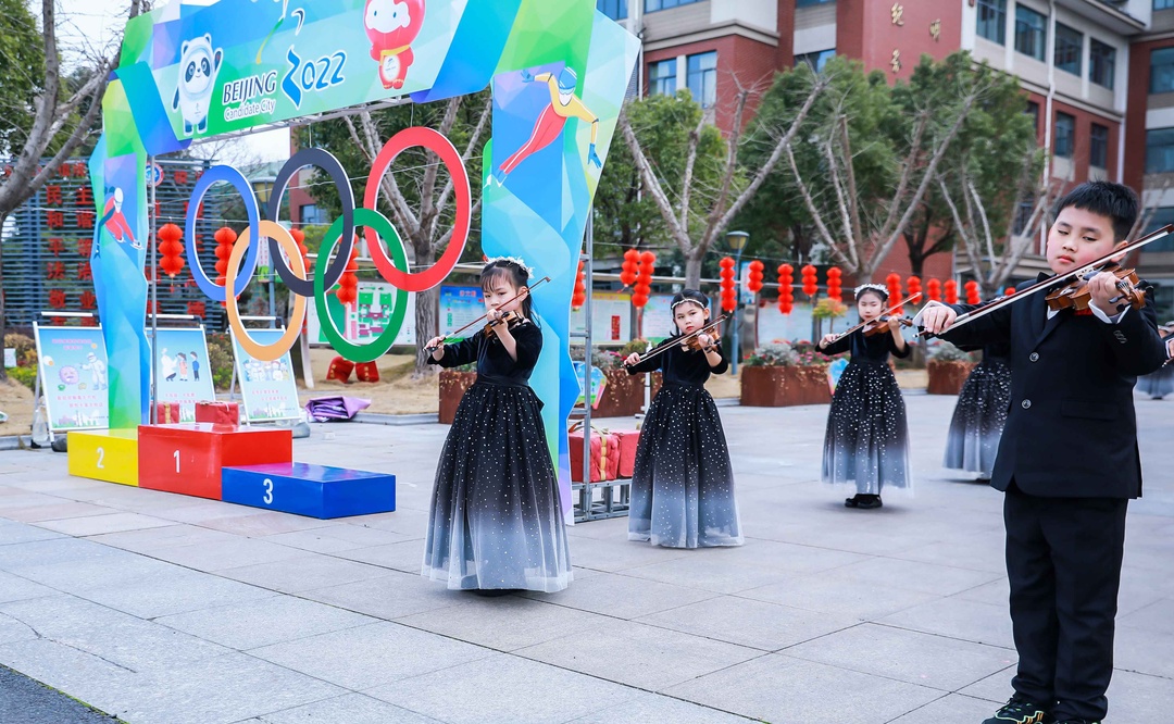 雪地、雪花,还有“冰墩墩”和“雪容融”,在上外松外,学生们一进校就被学校精心布置的“冰雪世界”所吸引。学校政教处副主任徐珺说:“寒假前,学校给学生布置了制作‘雪花’的任务,新学期希望每一位学生都能做一朵傲然绽放的雪花。”